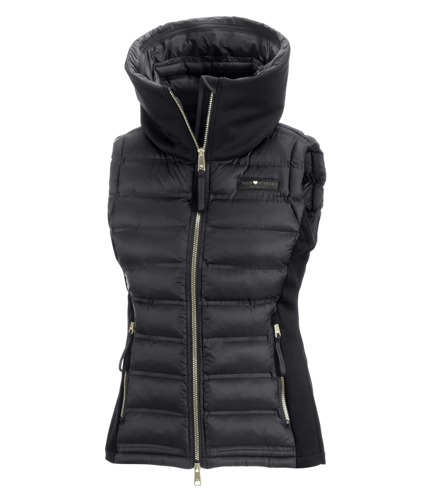 Superbe gilet en softshell extensible et nylon avec un garnissage très doux en imitation duvet devant et derrière. Coupe-vent. Double col et capuche rembourrée repliable dans le large col extérieur par fermeture à glissière, coutures thermosoudées, fermeture à glissière double sens avec sous-patte et protège-menton, 2 poches zippées devant. Logo élaboré sur la manche et le col. Avant, dos, col intérieur et capuche 100 % nylon, matière softshell 92 % polyester, 8 % élasthanne.