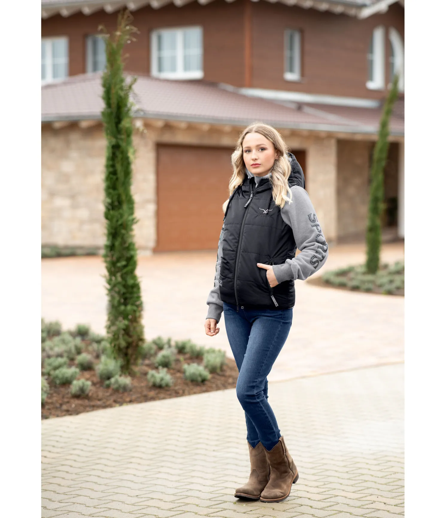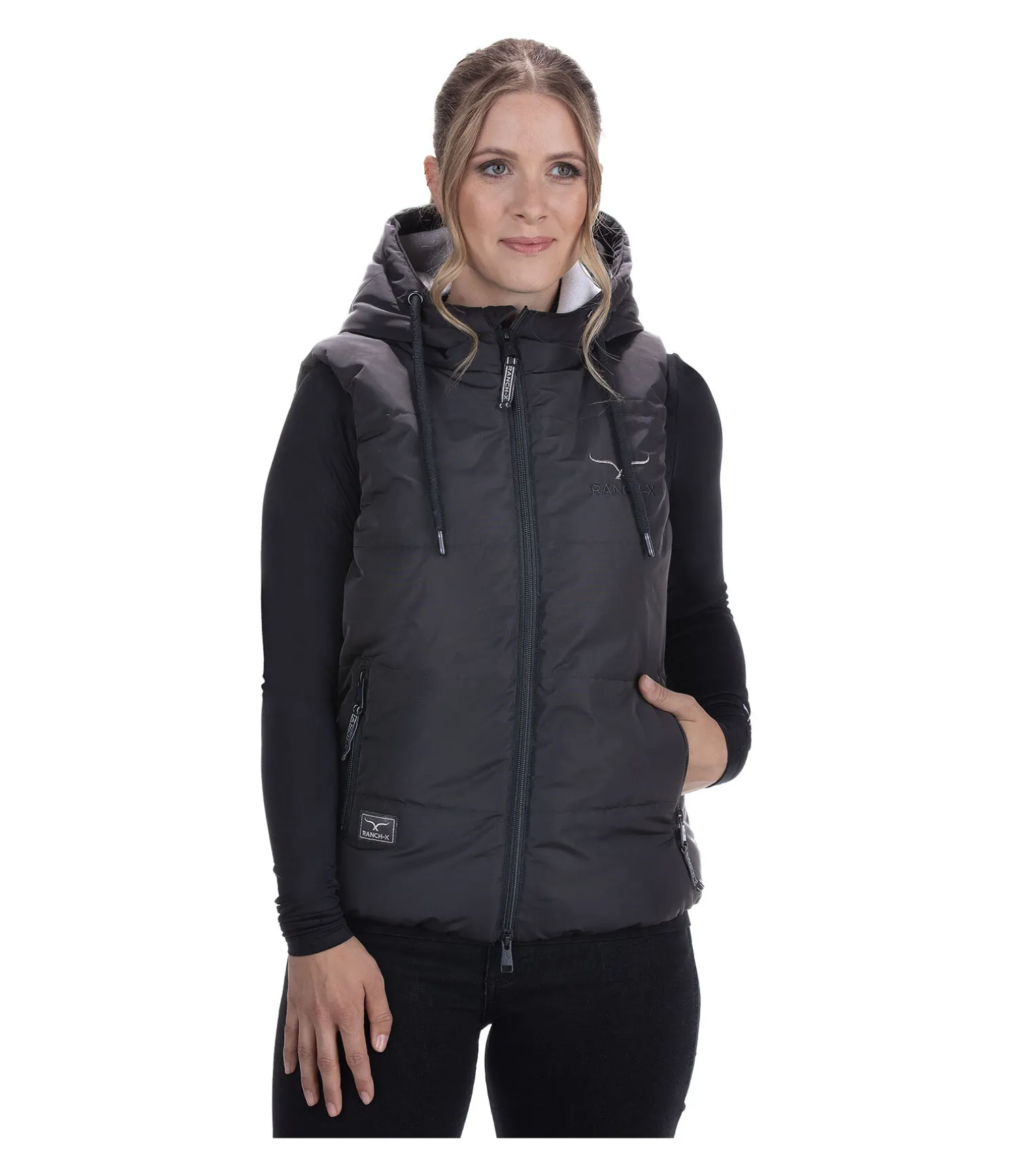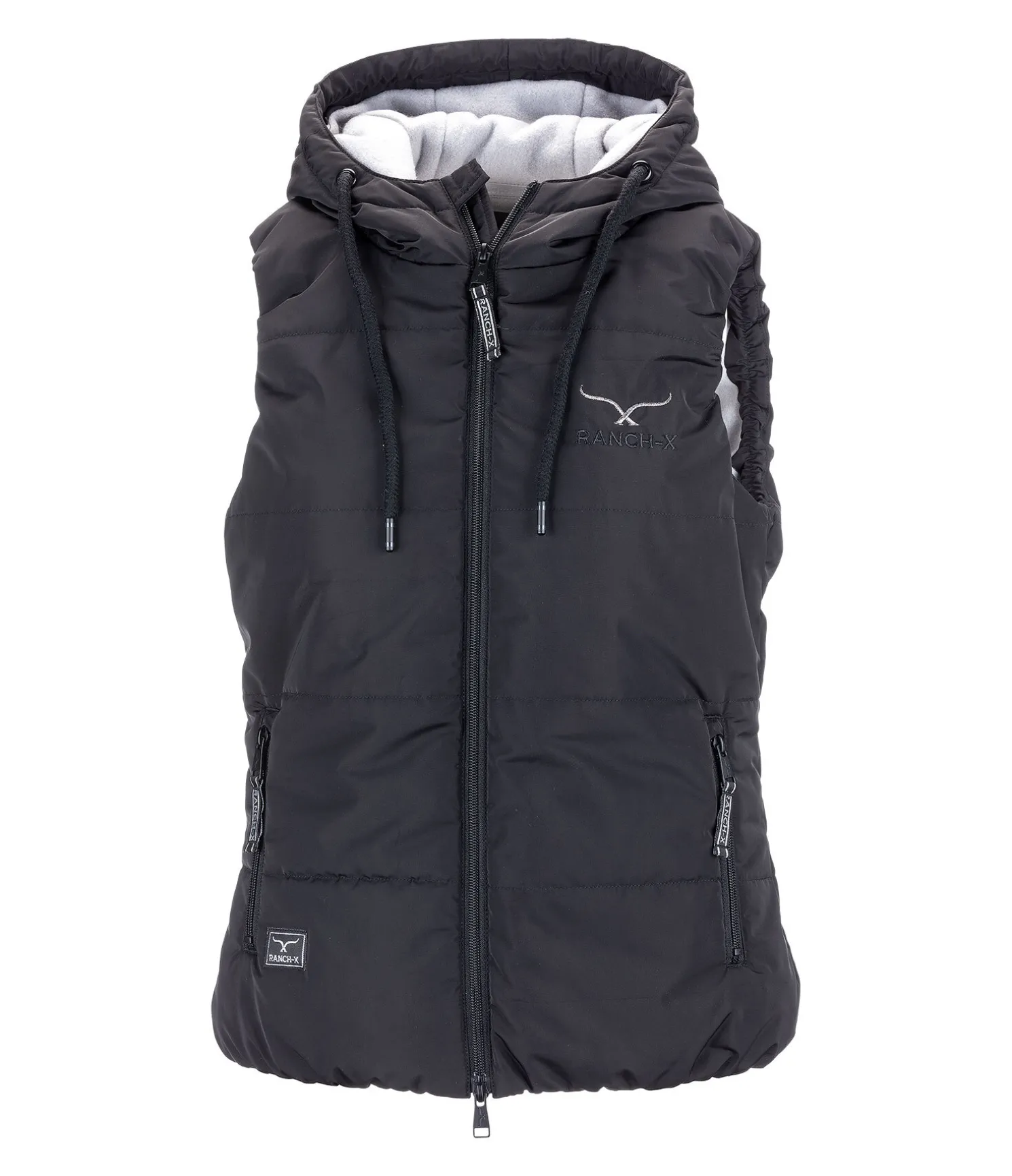 Gilet doudoune d’équitation respirant et coupe-vent. Doublure douce en imitation duvet. Capuche ajustable par cordon de serrage. Logo RANCH-X scintillant sur la poitrine et la capuche. Fermeture à glissière double sens. Poches latérales zippées. Élastique de réglage à la taille. 100 % polyester.