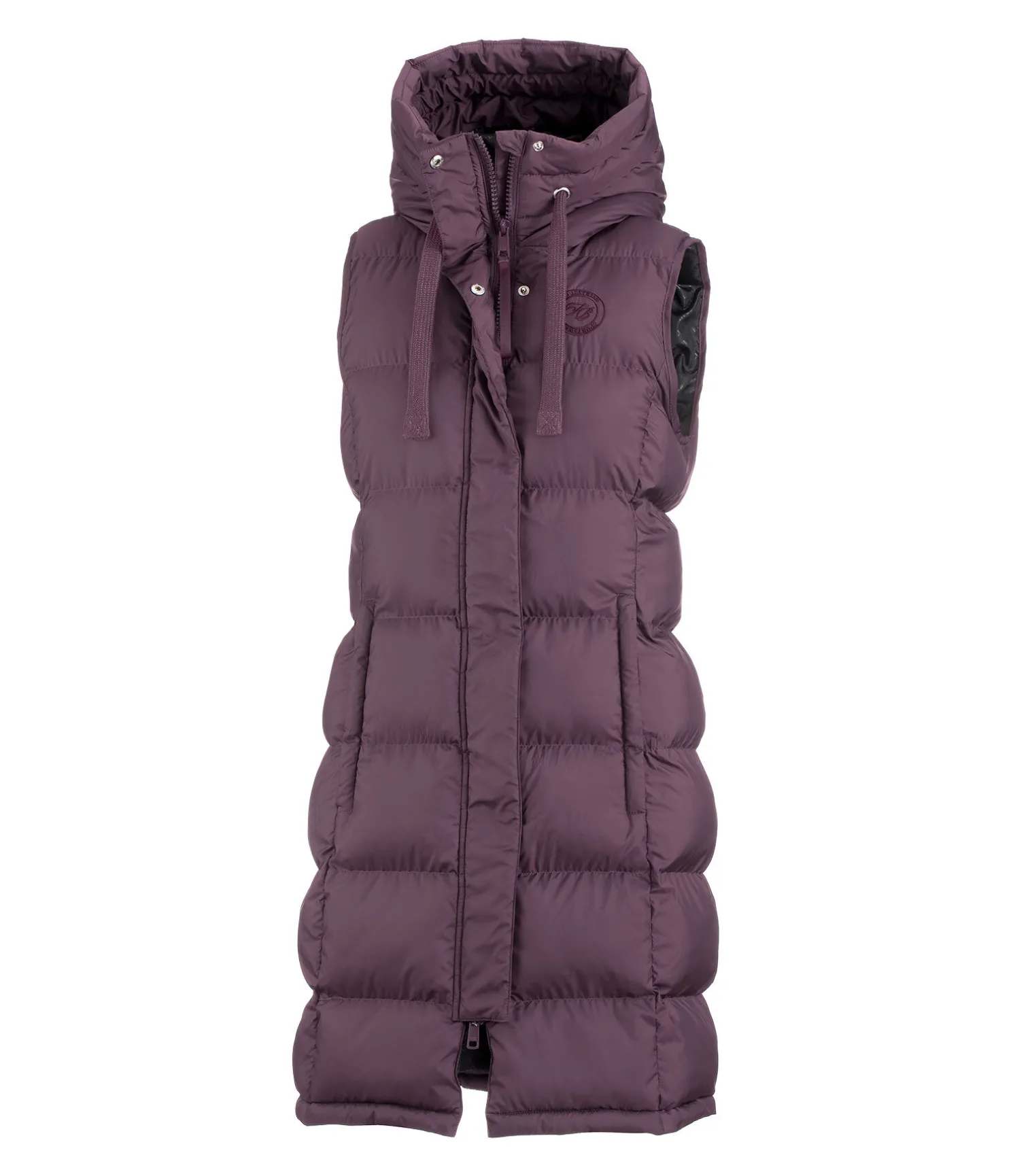 Gilet d’équitation long à capuche. Garnissage doux imitation duvet. Capuche haute réglable avec système d’attache dans le dos. Fermeture à glissière double sens dissimulée. Deux poches latérales zippées dissimulées doublées en polaire douce. Longue fente cavalière zippée avec sous-patte à l’arrière. Broderie Felix Bühler sur la poitrine. 100 % Polyester.