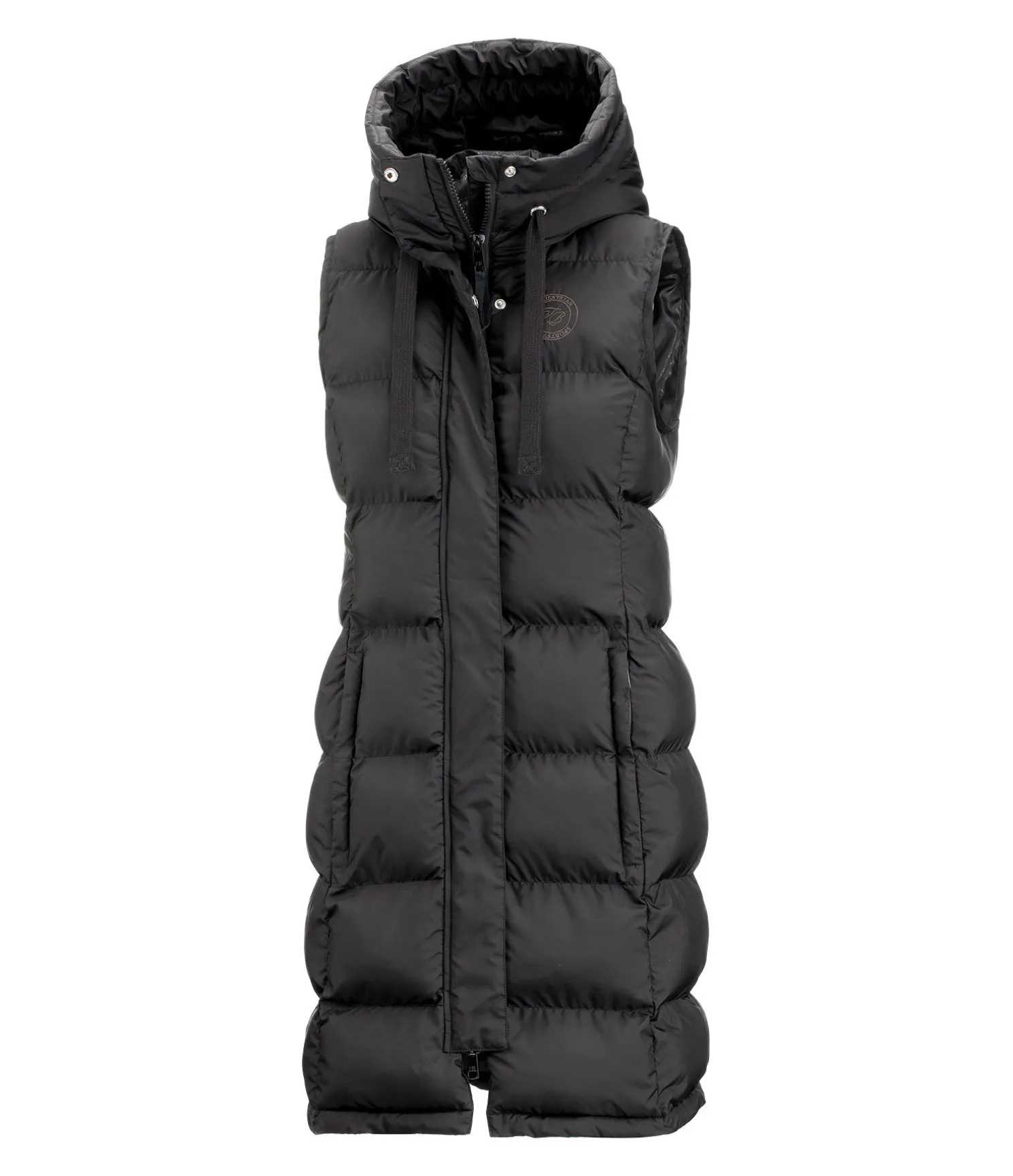 Gilet d’équitation long à capuche. Garnissage doux imitation duvet. Capuche haute réglable avec système d’attache dans le dos. Fermeture à glissière double sens dissimulée. Deux poches latérales zippées dissimulées doublées en polaire douce. Longue fente cavalière zippée avec sous-patte à l’arrière. Broderie Felix Bühler sur la poitrine. 100 % Polyester.