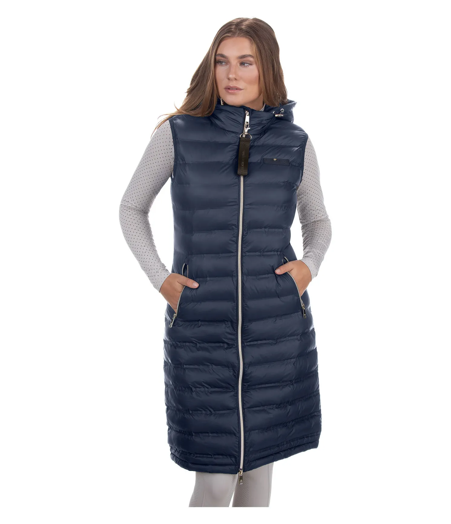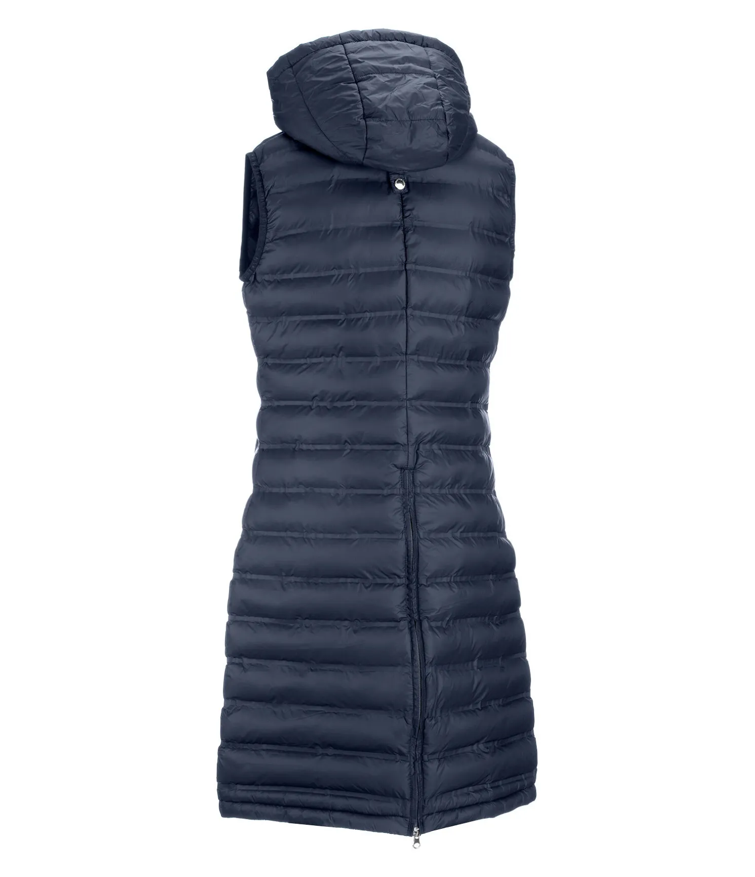 Gilet long léger matelassé avec coutures thermosoudées. Garnissage léger en imitation duvet. La capuche peut se ranger dans le col, s’enlever facilement grâce à la fermeture à glissière ou se fixer dans le dos grâce au bouton-pression. Longue fente cavalière zippée à l’arrière, fermeture à glissière double sens avec sous-patte et protège-menton, 2 poches zippées à l’avant. Badge Felix Bühler sur la poitrine. Poignets élastiqués. 100 % nylon.