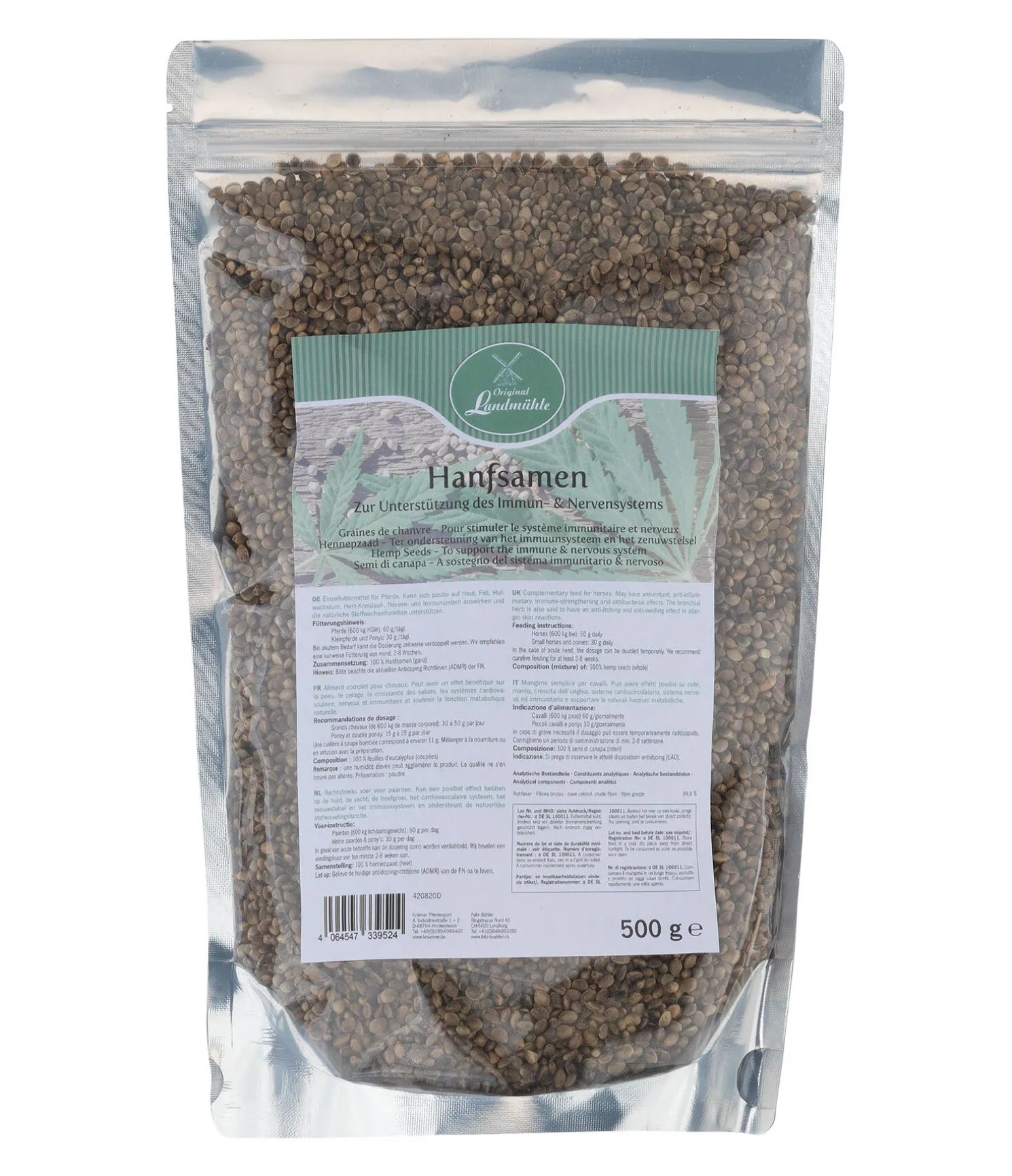 Nos graines de chanvre Original Landmühle sont riches en acides aminés essentiels comme les oméga 3 et 6. Elles peuvent ainsi avoir un effet bénéfique sur la pousse du poil, la croissance des sabots, soutenir le développement musculaire et aider à réduire les tensions. Elles contiennent également des oligo-éléments importants, des minéraux et de la vitamine E, permettant de renforcer le système immunitaire. On attribue également au chanvre un effet apaisant pour les problèmes de peau tels que les démangeaisons. Celui-ci est aussi connu pour stimuler le métabolisme et avoir un effet anti-inflammatoire, il est donc souvent utilisé en cas de maladies chroniques de l’appareil locomoteur.