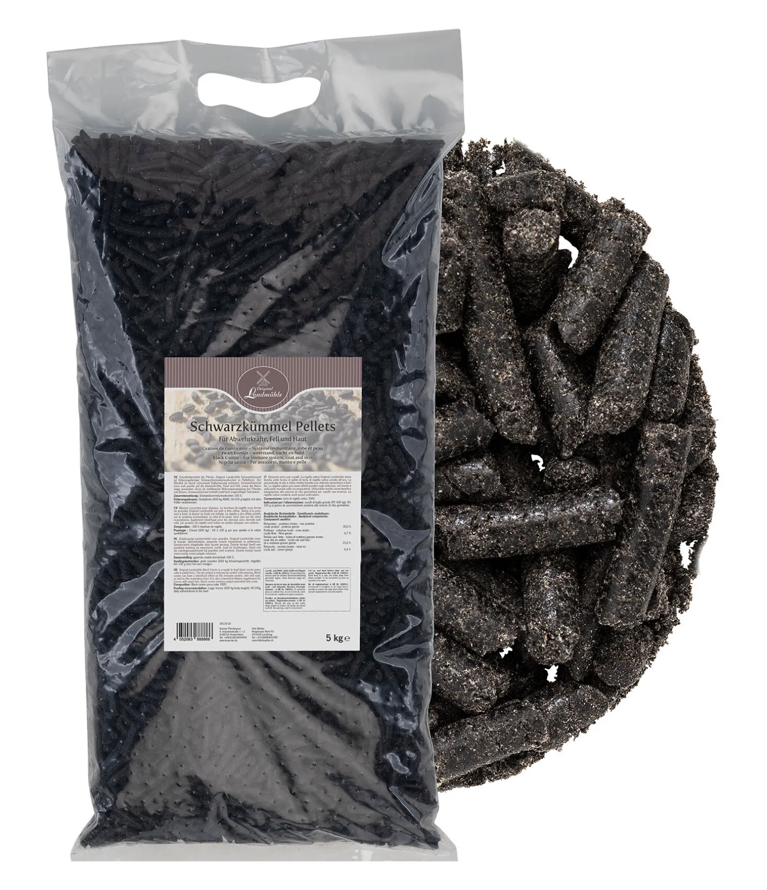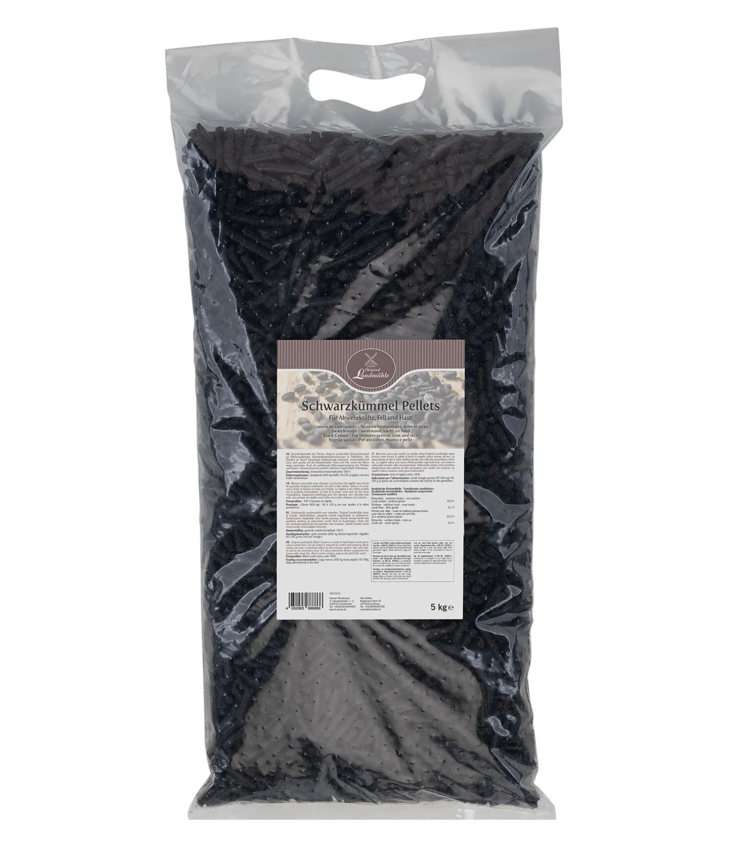 Graines de cumin noir prêtes à la consommation, sous forme de granulés. Teneur en huile réduite grâce à la pression des graines à froid. Peuvent avoir une influence positive sur les défenses immunitaires, la robe et les crins ainsi que sur les voies respiratoires. Contiennent des acides gras polyinsaturés.