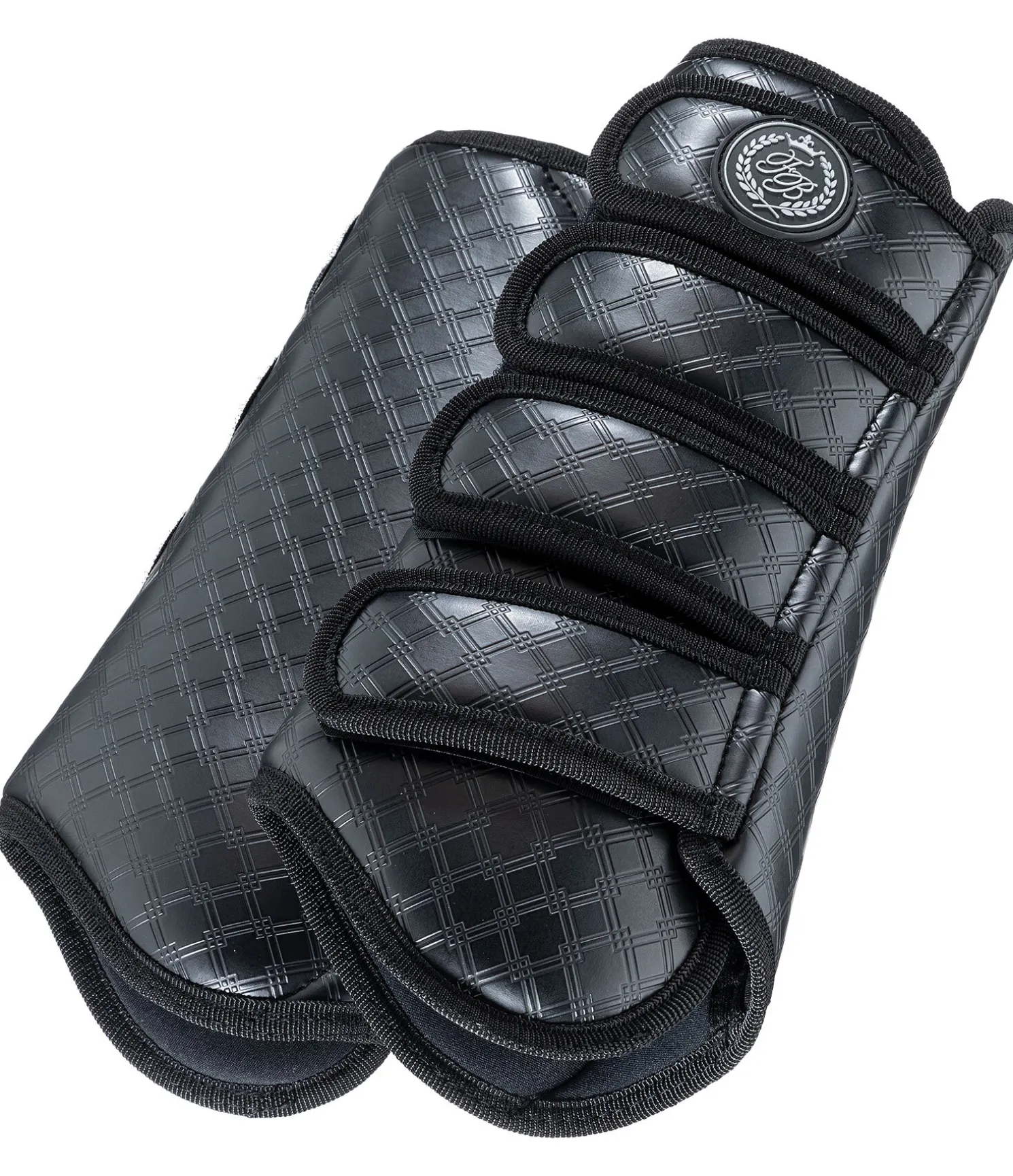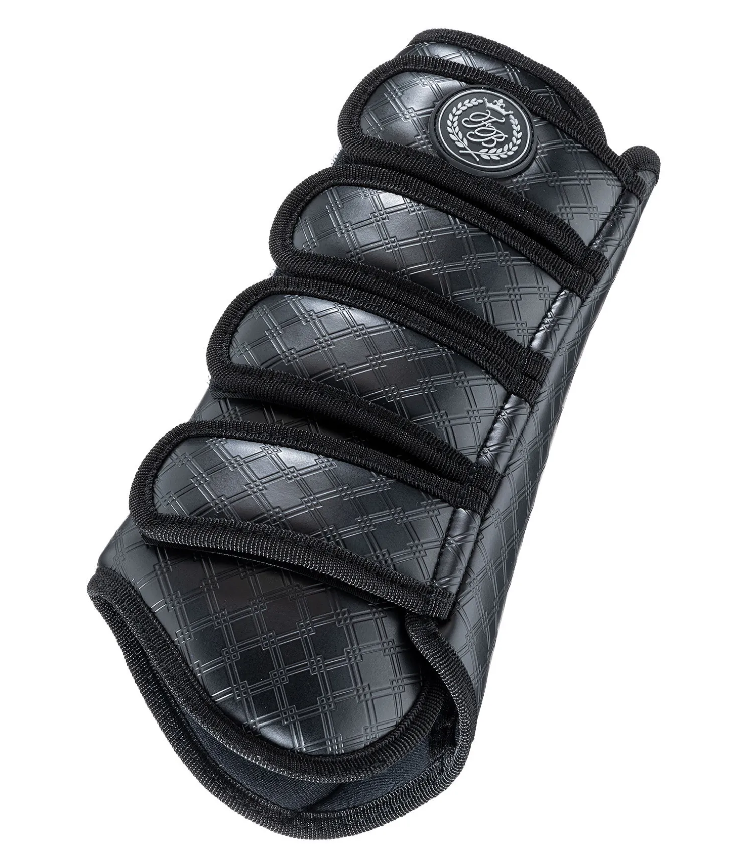 Guêtres anatomiques au look sportif en matière synthétique élégamment gaufrée. Avec protection intégrale protégeant des impacts sur les tendons et 4 pattes auto-agrippantes robustes pour un maintien sûr. Doublure moelleuse en caoutchouc-chloroprène pour une protection optimale contre les chocs. Pour postérieurs.