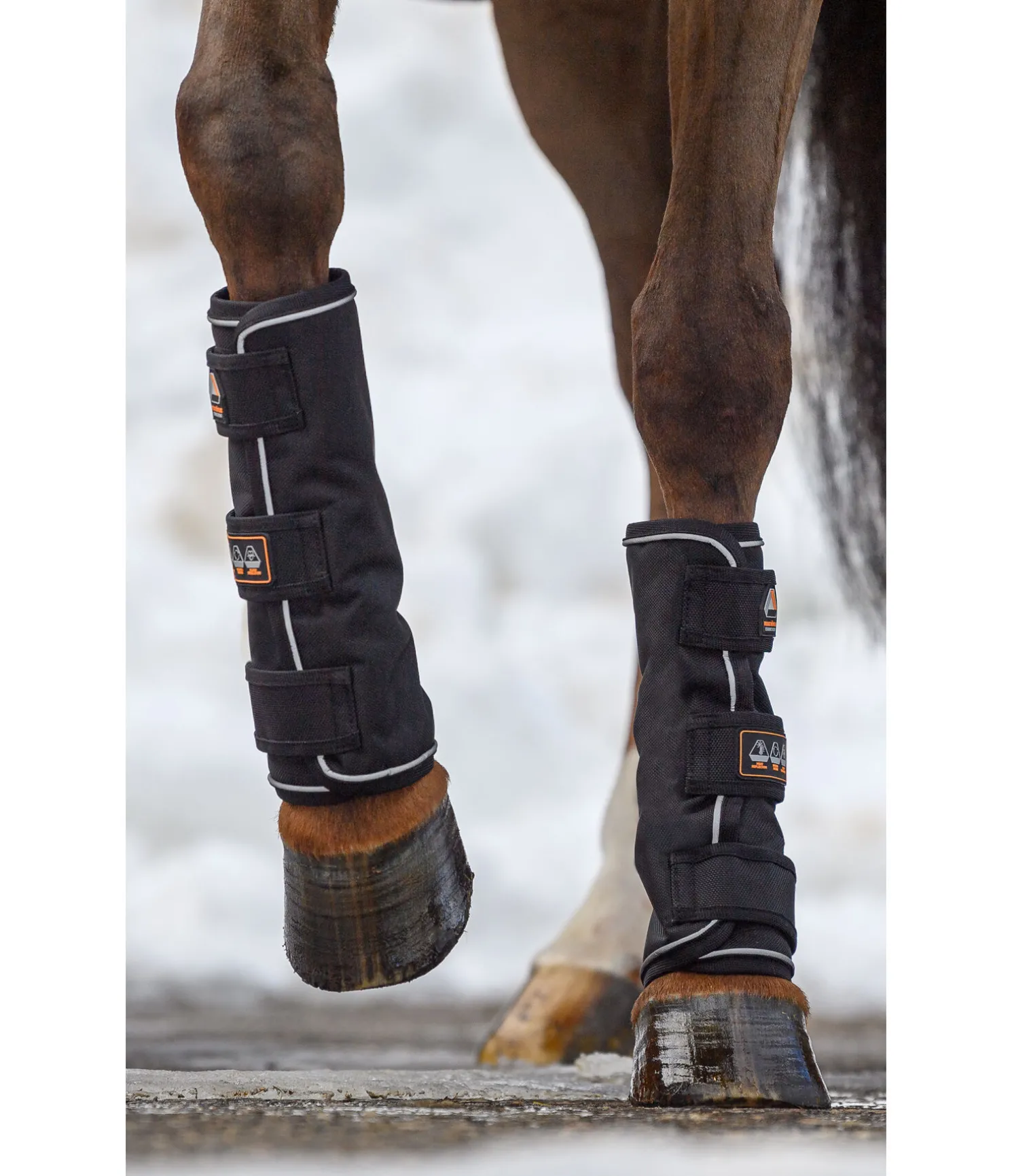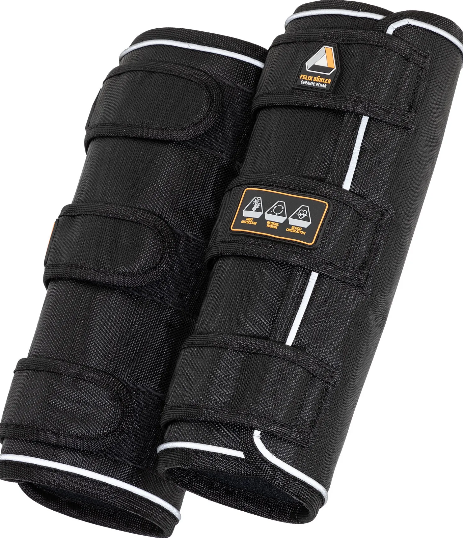 Guêtres d’extérieur fonctionnelles particulièrement solides étant, grâce à leur extérieur en nylon résistant à la déchirure et imperméable (1.680 deniers, colonne d’eau 3.000 mm, respirabilité 3.000 g/m2/24h), parfaitement adaptées au paddock et au pré par mauvais temps. Les fibres de céramique favorisent la circulation sanguine, ce qui peut permettre de soutenir le processus de régénération et de soulager les troubles musculo-squelettiques chroniques. Le passepoil réfléchissant représente une sécurité supplémentaire. 3 pattes auto-agrippantes résistantes permettent un enfilage et un retrait rapides. Conservent leur forme grâce à un garnissage léger (50 g). Leur légèreté et leur coupe droite leur permettent de s’adapter parfaitement à la jambe du cheval, sans réduire sa liberté de mouvement. Lavage en machine à 30°C. Extérieur 100 % nylon, doublure en matière respirante Air mesh avec fibres de céramique fondues. Remarque : Ne pas les utiliser dans de grands espaces très boueux ou avec des flaques profondes. L’humidité pourrait pénétrer dans les guêtres par le bas ; la doublure n’est pas imperméable. Nous déconseillons aux femmes enceintes ainsi qu’aux animaux en gestation l’utilisation des articles contenant des fibres de céramique. Vendues par paire.