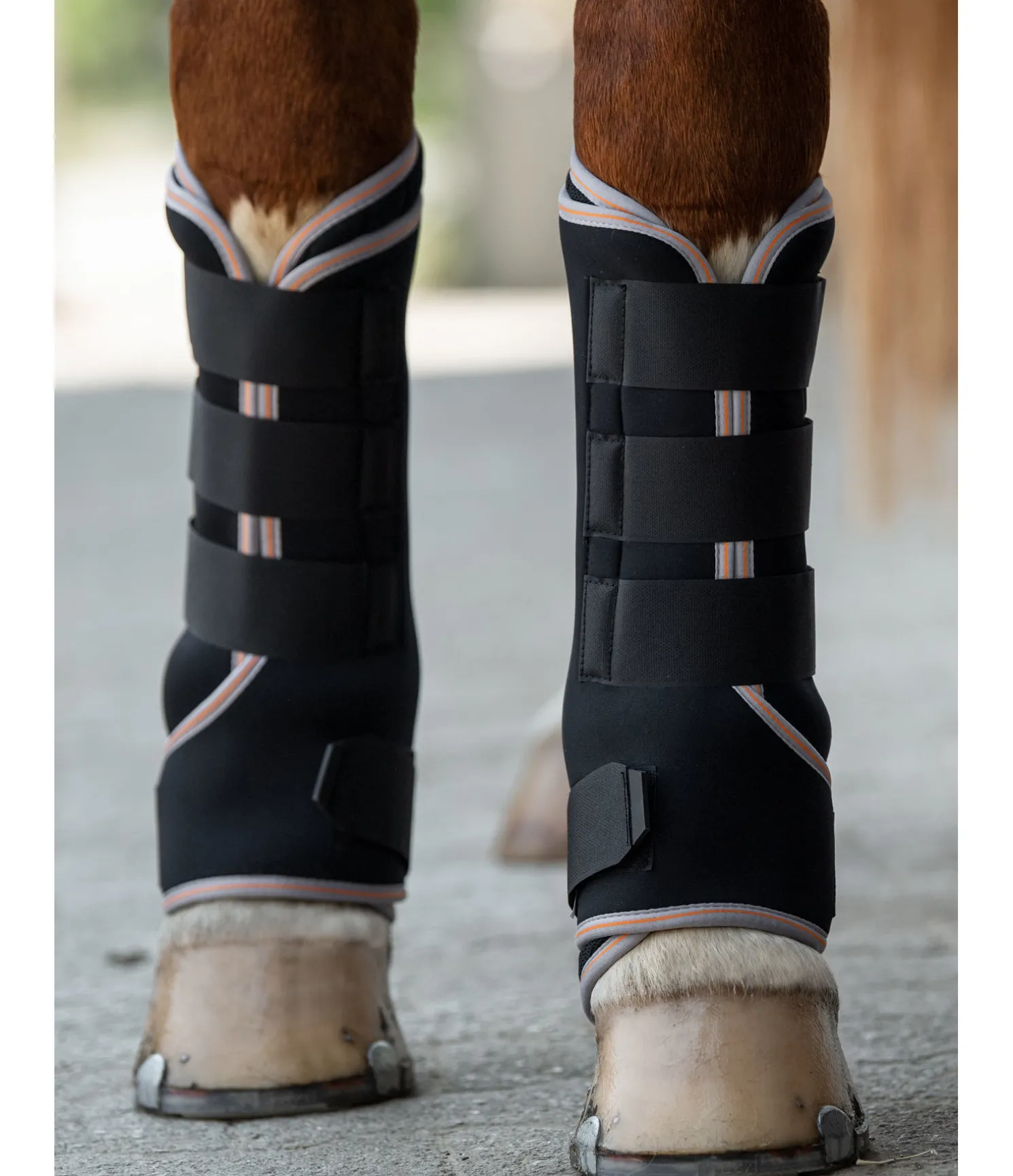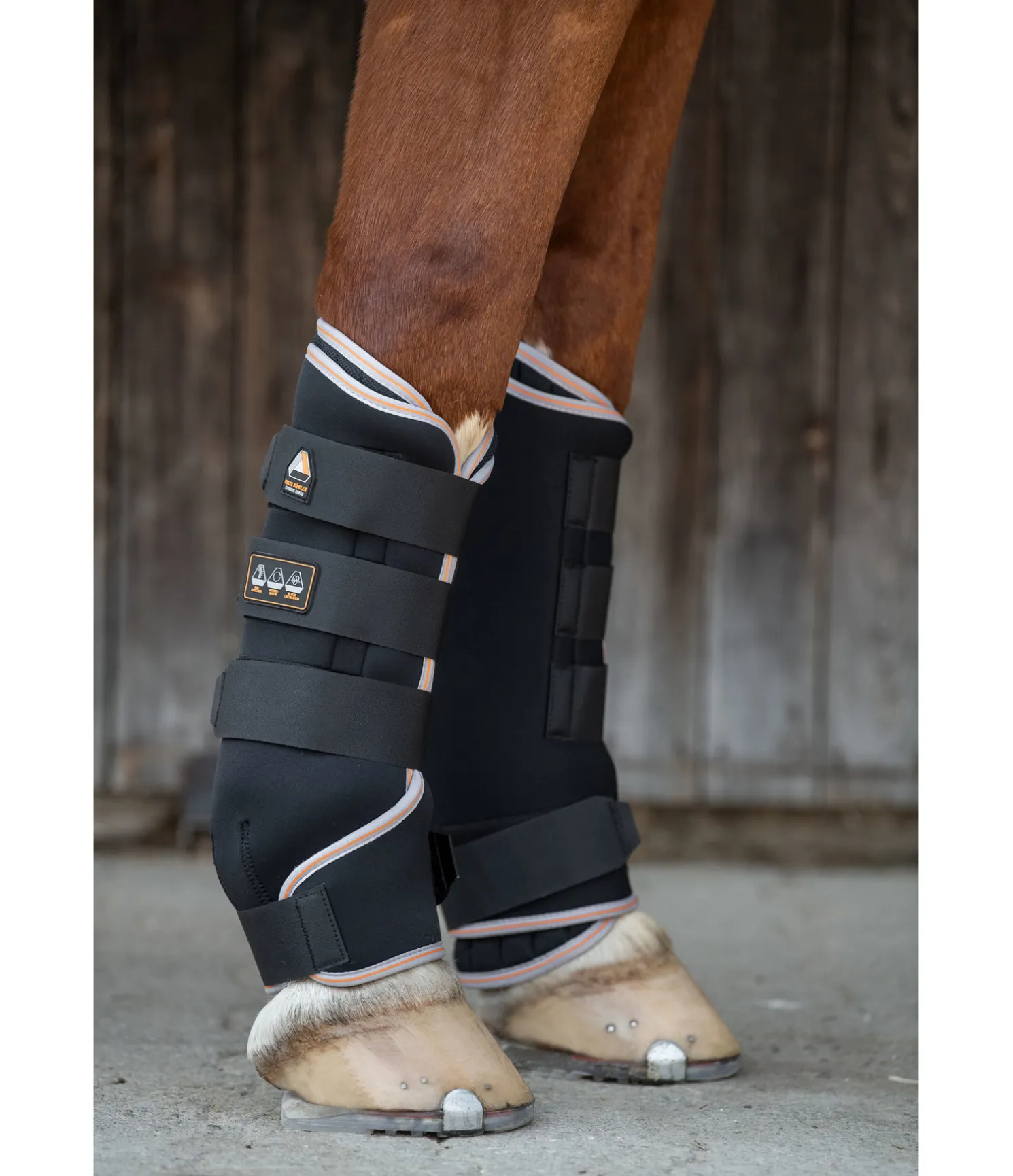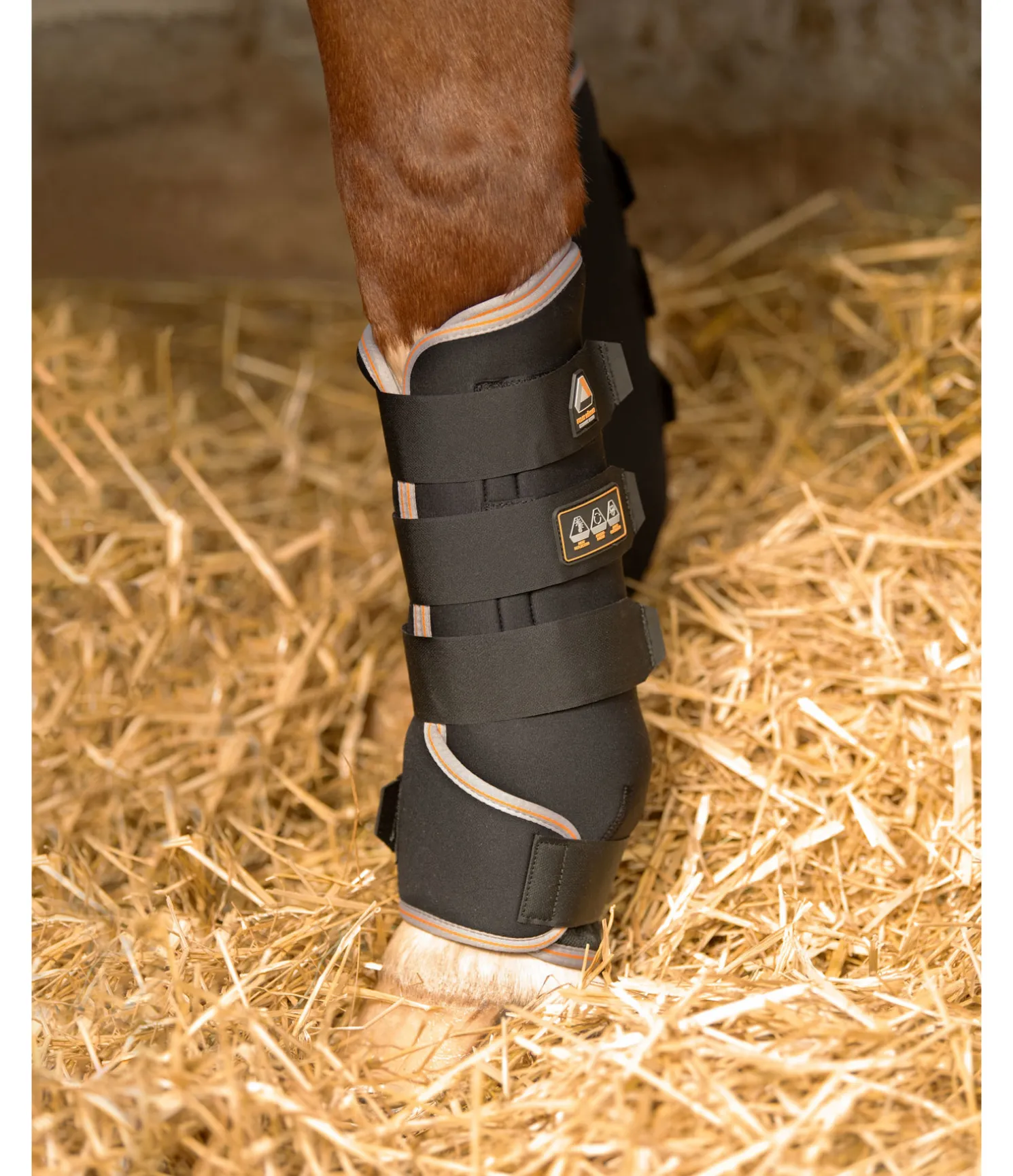 Guêtres d’écurie relaxantes avec doublure moelleuse en caoutchouc-chloroprène souple. À l’intérieur, un coussin contenant des fibres de céramique qui réfléchissent la chaleur corporelle et améliorent sensiblement la circulation sanguine s’ajuste parfaitement grâce aux pattes auto-agrippantes. Peuvent accélérer la guérison et réduire les douleurs liées à des maladies chroniques de l’appareil locomoteur. Idéales en cas d’arthrose, d’éparvins ou de nécrose de la pince, surtout pour éviter une mise en route « à froid » après une nuit au box. Coupe particulièrement longue qui descend jusqu’à la couronne pour une protection optimale. Forme anatomique. 4 pattes auto-agrippantes pour un ajustement et maintien parfaits. Convient pour les antérieurs et les postérieurs. Lavables en machine à 30° C (veillez à fermer les pattes auto-agrippantes avant le lavage). Ne pas mettre au sèche-linge. 100 % nylon, doublure 100 % caoutchouc-chloroprène. Vendues par paire.