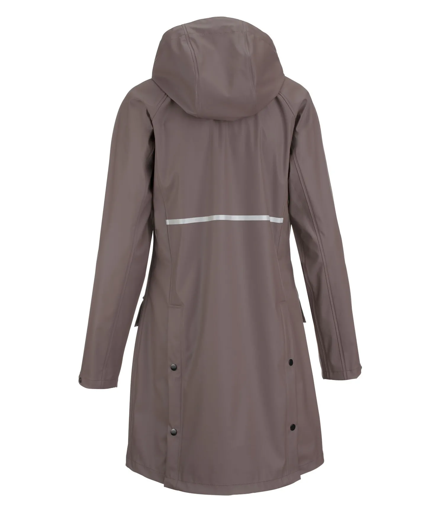 Imperméable (5.000 mm) et coupe-vent d’équitation long. Intérieur de couleur contrastante. Fermeture à glissière double sens dissimulée avec protège-menton. 2 fentes cavalières avec boutons-pression dans le dos. 2 poches à rabat. Capuche et bas des manches réglables. Imprimés réfléchissants à l’avant et l’arrière. 100 % polyuréthane.