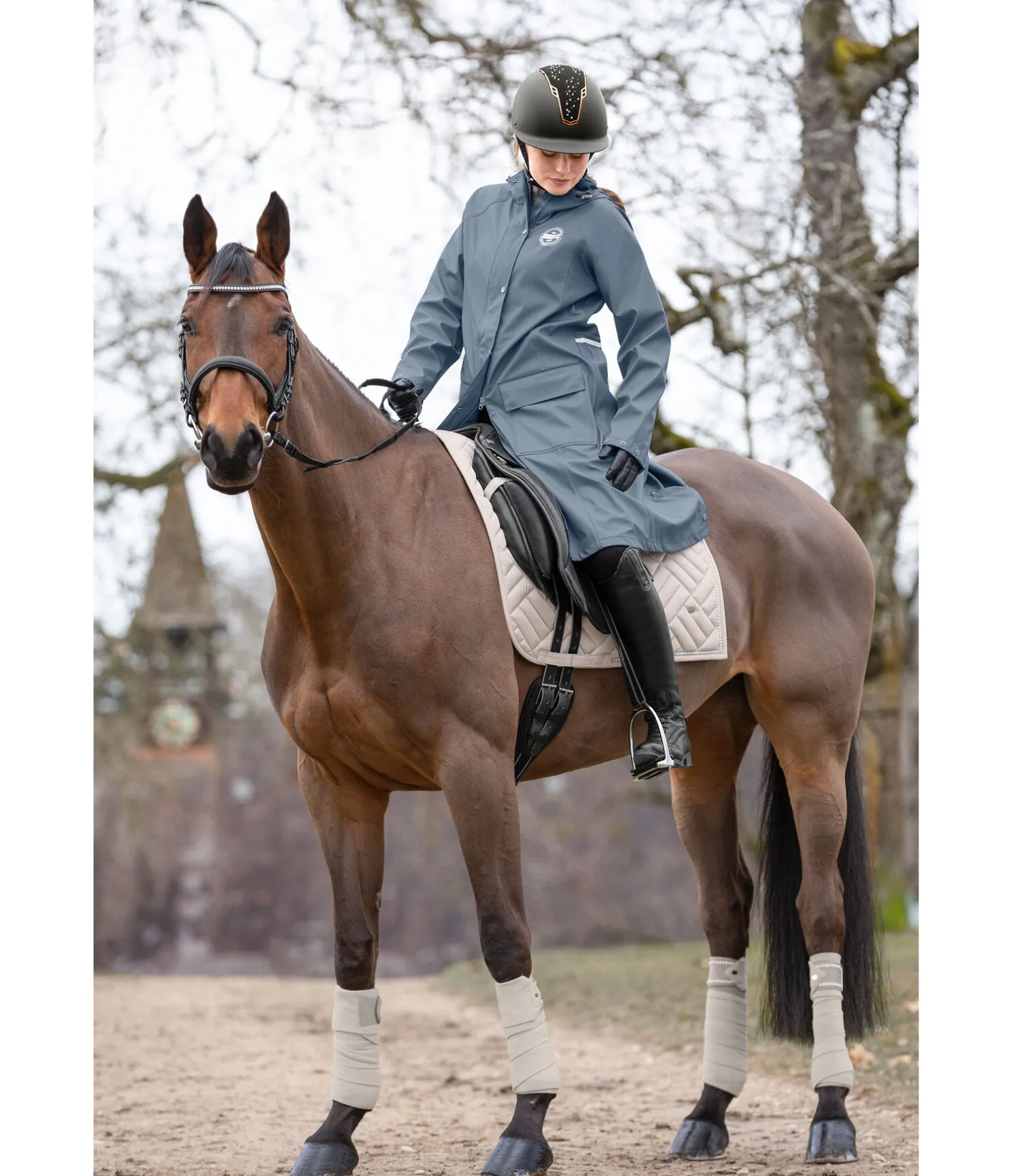 Imperméable d’équitation très long et confortable. Longue fente cavalière doublée. Capuche réglable avec système de fixation dans le dos. Imperméable (5 000 mm) et coupe-vent. Courroies de jambes réglables pour maintenir l’imperméable en place lors de la pratique de l’équitation. Fermeture à glissière double sens dissimulée avec sous-patte et protège-menton. Bas de manches réglables. 2 poches à rabat avec imprimé Felix Bühler réfléchissant. Logo réfléchissant sur la poitrine. Passepoil réfléchissant dans le dos. 100 % polyuréthane.