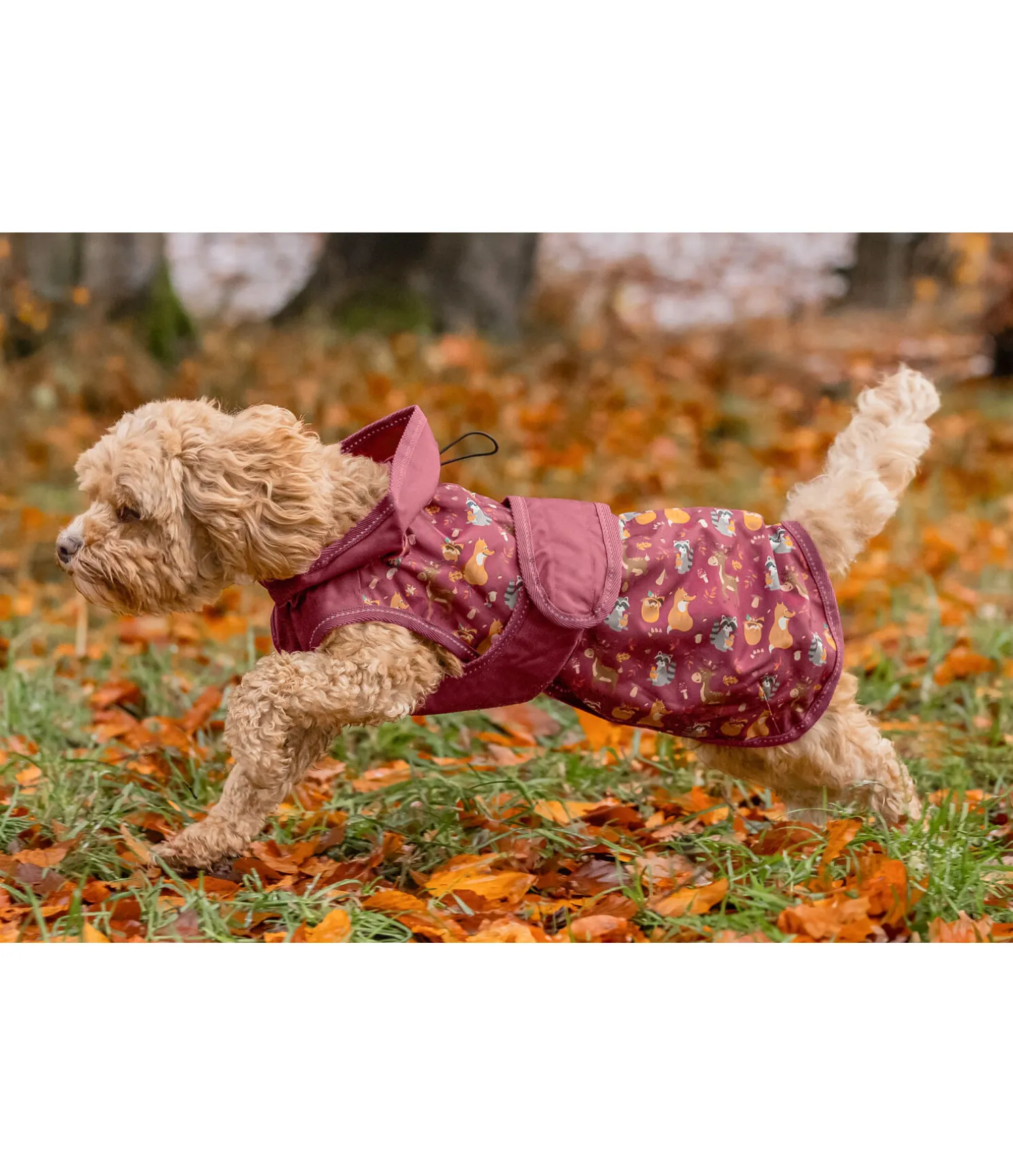 Manteau imperméable (3.000 mm), respirant (3.000 g/m2/24h) et coloré avec motifs automnaux et liseré réfléchissant. Idéal pour les journées d’automne humides et froides. Dessus en polyester Oxford 600 deniers robuste et résistant à la déchirure. Réglable au cou par cordon de serrage et au poitrail par patte auto-agrippante à fermer dans le dos pour le meilleur ajustement. Passage de laisse zippé étanche dans le dos et passage de collier au col. Des courroies de cuisses dissimulées permettent d’éviter que le manteau ne glisse lorsque le chien s’amuse, sans pour autant le gêner. Découpe au niveau des épaules pour une plus grande liberté de mouvement. 100 % polyester.
