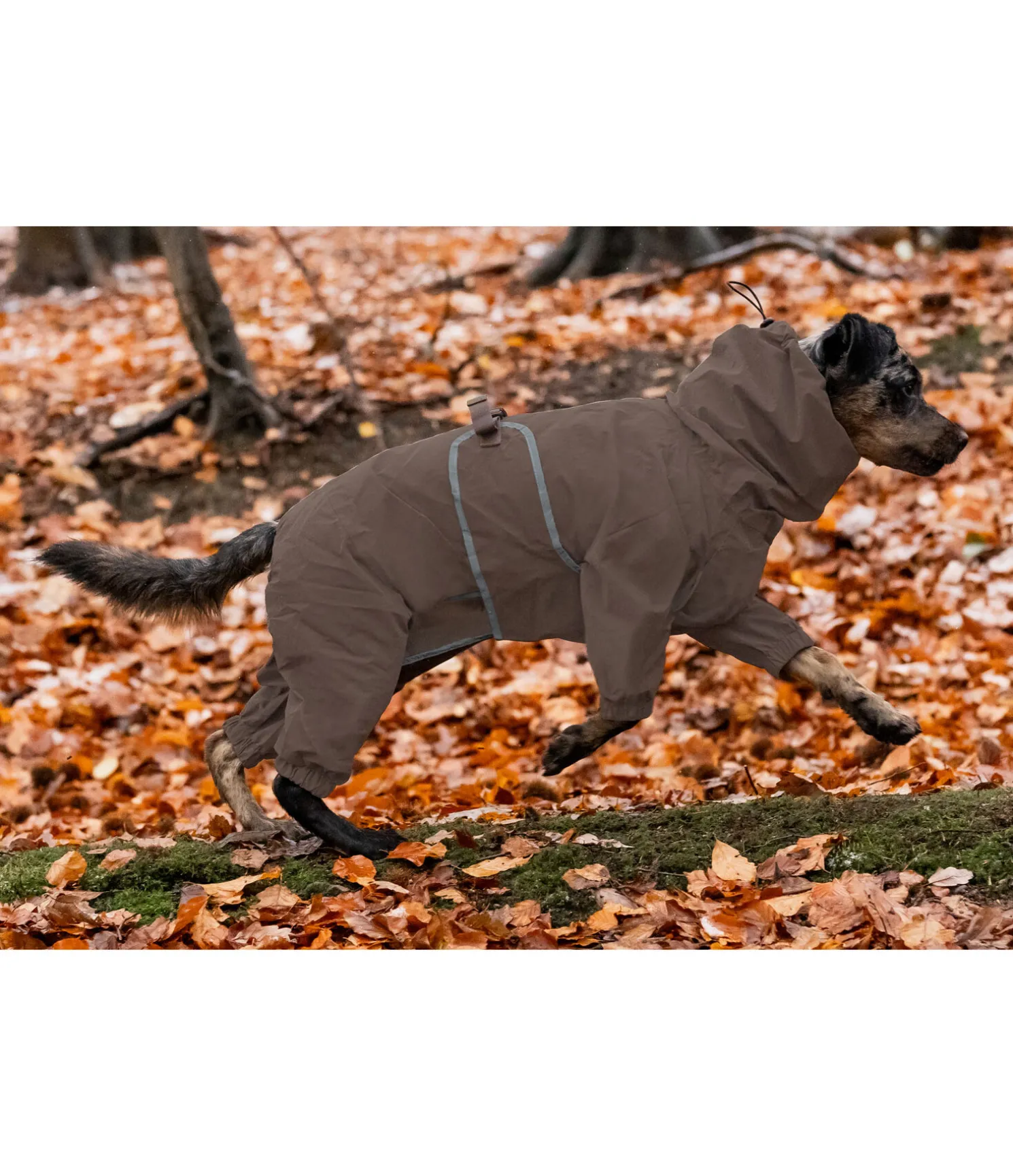 Imperméable offrant une protection optimale de la tête aux pattes en cas de pluie. Coutures thermo-soudées et fermeture à glissière étanche sur le dos. Idéal pour les chiens à poils longs grâce à sa coupe extra-longue. Col montant extra haut ajustable par élastique avec ouverture pour collier. Élastique froncé sur le bas des pattes. Long rabat ventral réglable avec fermeture à clip. Éléments réfléchissants pour plus de sécurité dans l’obscurité. Pour enfiler le manteau, il suffit d’ouvrir complètement la fermeture à glissière et le clip de la sangle ventrale, de faire passer la tête du chien par l’encolure et les quatre pattes dans les jambes de l’imperméable. Fermer la fermeture à glissière sur le dos ainsi que la fermeture à clip de la sangle ventrale. La sangle ventrale et le col sont réglables et ajustables afin d’éviter que le manteau ne glisse et que la pluie ne s’infiltre. 100 % polyester.