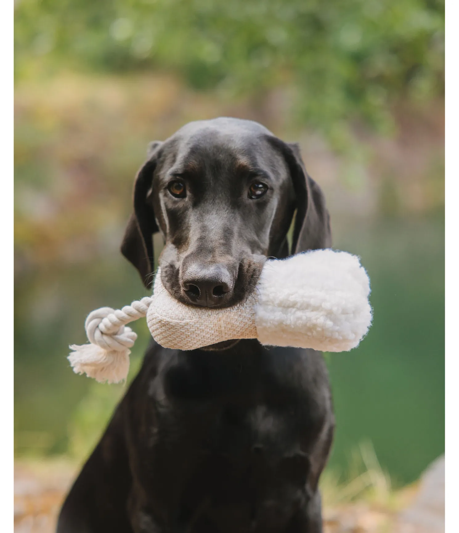 Os en peluche sherpa et tissu d’ameublement avec cordelette. Couineur intégré. 17,5 x 11 cm.