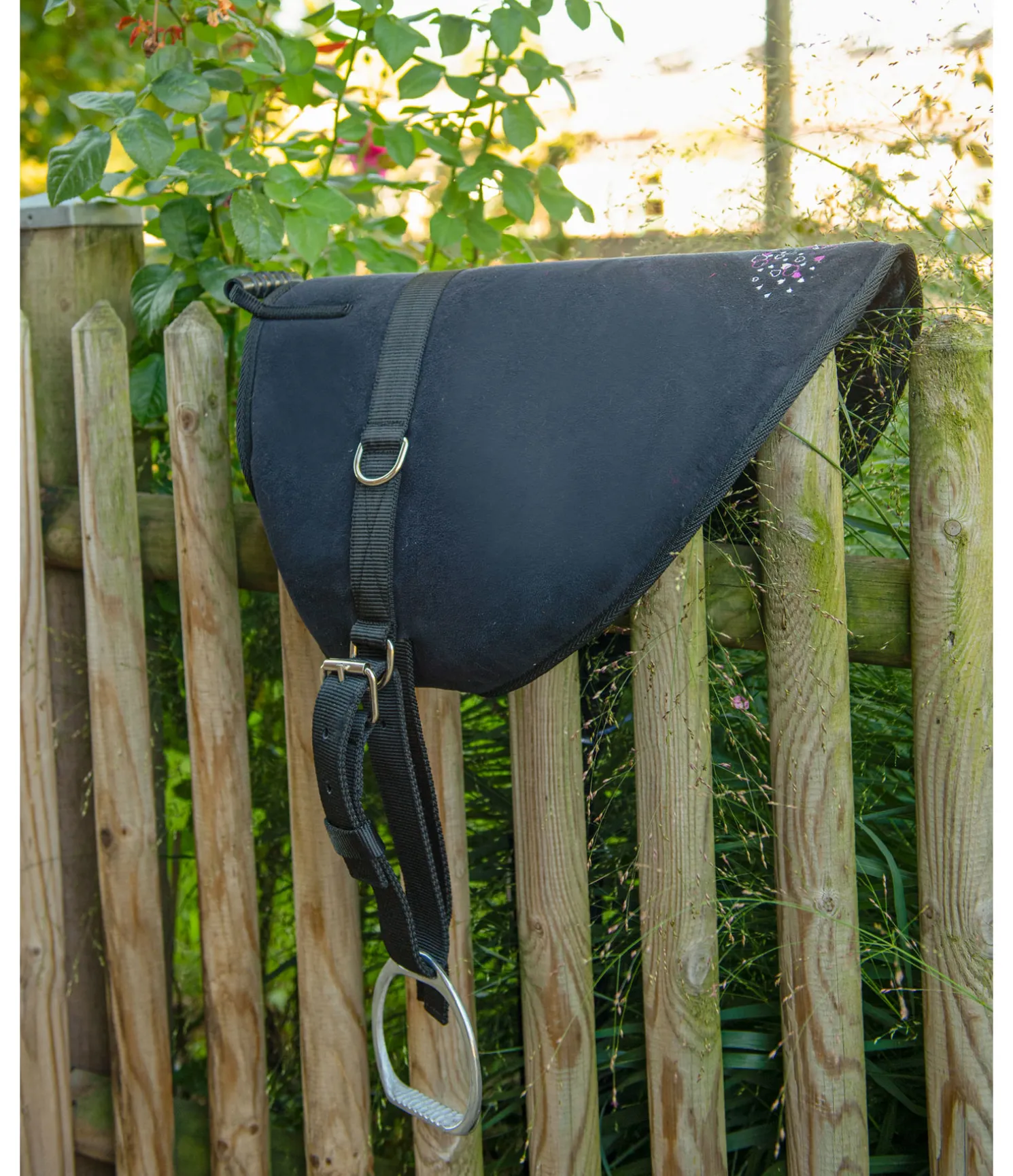 Kit avec bardette pratique pour enfants avec adorable broderie décorative. Bardette résistante avec dessus en suédine antidérapante et dessous en polaire Teddy moelleuse rendant l’utilisation d’un tapis de selle superflue. Avec poignée, étrivières, étriers (largeur du plancher 7,5 cm) et sangle (longueur 40 cm). Anneaux supplémentaires pour fixer un enrênement ou d’autres étrivières. Compatible avec d’autres sangles et étriers.