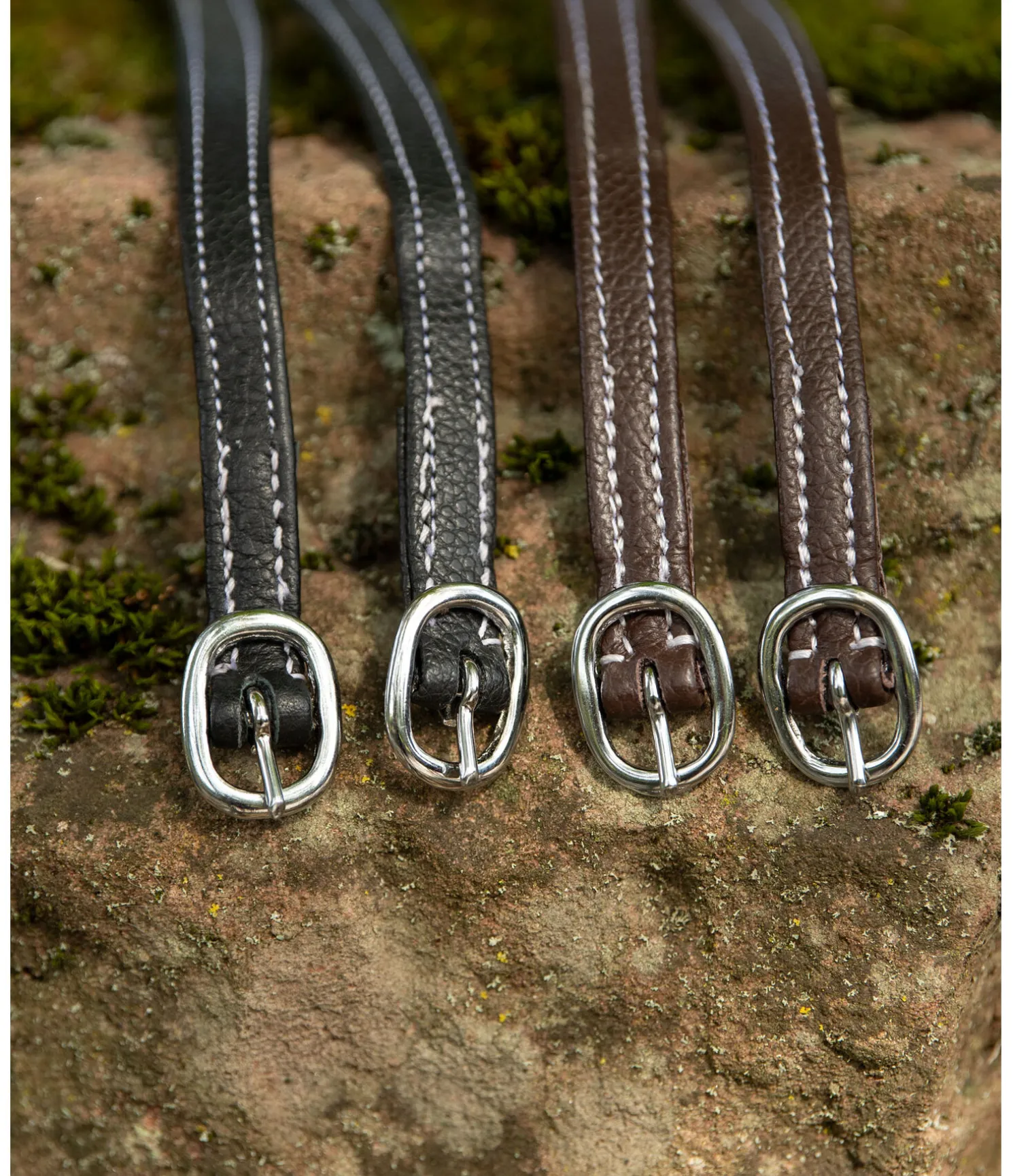 Cuir de grande qualité avec surpiqûres de couleur blanche. Boucle argentée. Vendues par paire.
