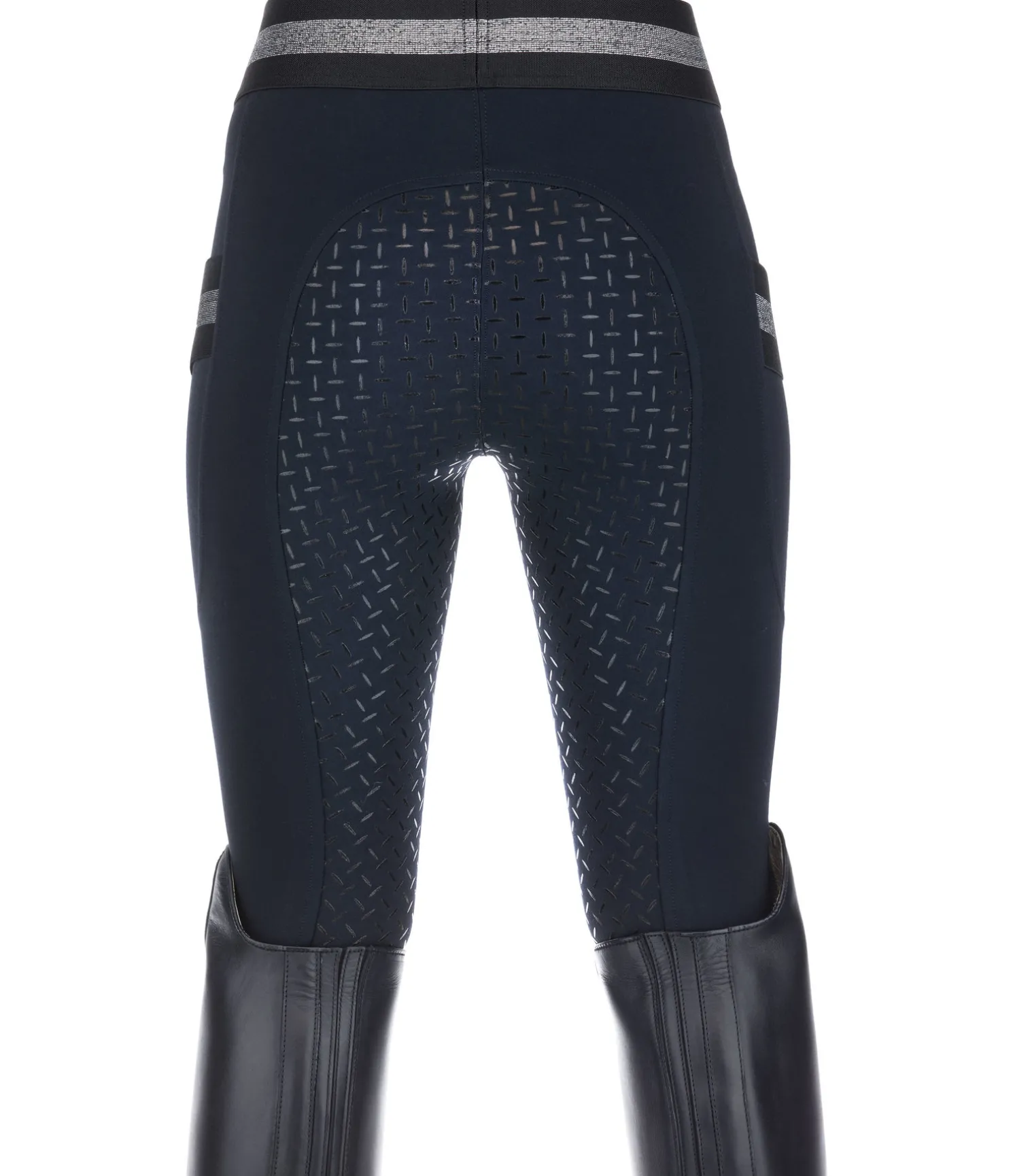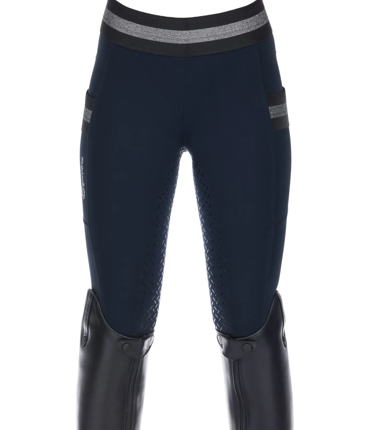 Legging d’équitation sportswear. Matière respirante et très confortable. Fond intégral en silicone. Matière stretch de grande qualité extensible dans 4 directions. Ceinture élastiquée pailletée. Poche pour téléphone portable sur la cuisse. Bas de jambe extensible sans patte auto-agrippante. 68 % viscose, 27 % polyamide, 5 % élasthanne.