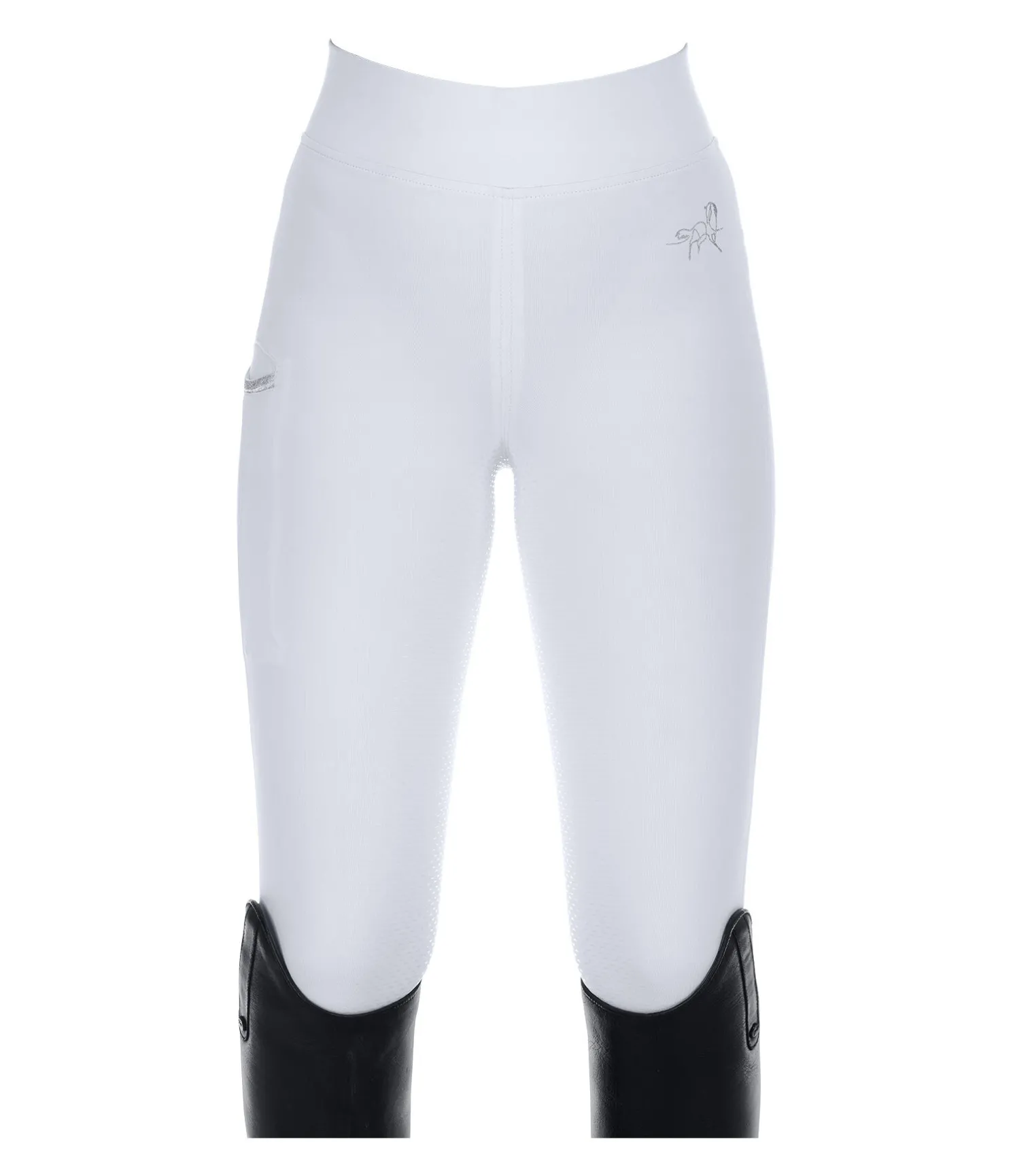 Legging d’équitation extrêmement confortable à fond intégral grip en silicone. Matière stretch respirante et extensible dans 4 directions. Poche latérale pour téléphone portable avec bande scintillante sur la cuisse droite. Motif petit cheval sur jambe gauche. Logo Equilibre et passepoil scintillants à l’arrière. 78 % polyester, 22 % élasthanne.