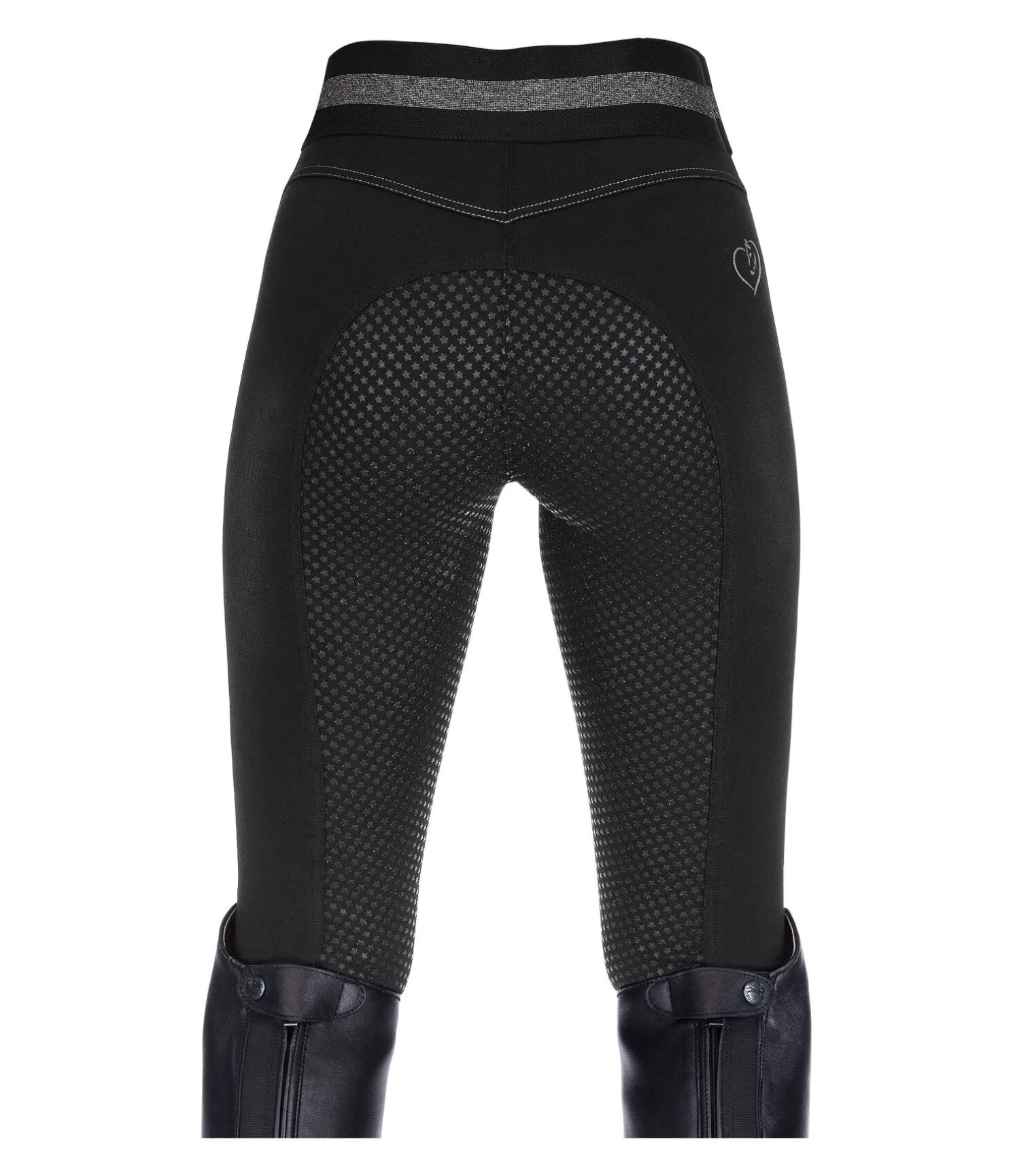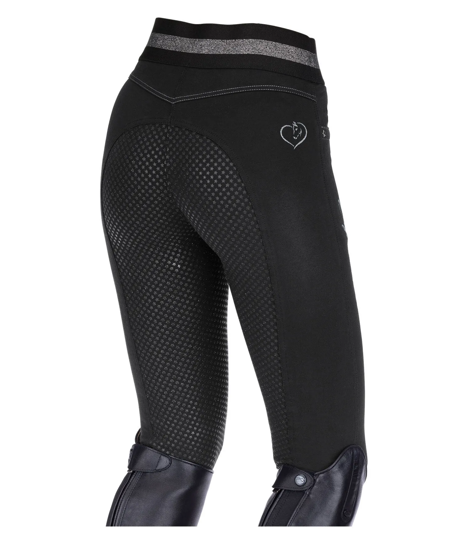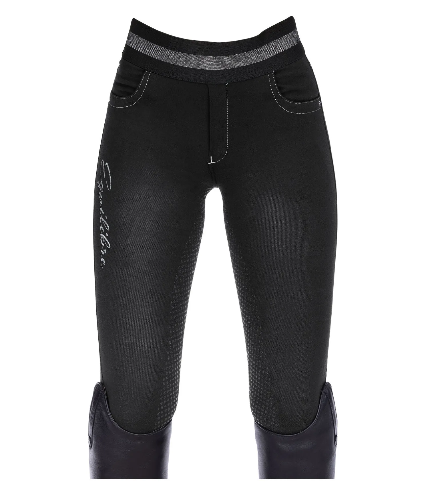 Legging d’équitation en jean avec fond intégral grip en silicone. Matière stretch extensible dans 4 directions. Ceinture élastiquée scintillante. Bas de jambe extensible. Deux poches avant ornées de petits rivets étoilés. Signature « Equilibre » scintillante sur la jambe et à l’arrière. 63 % coton, 30 % polyester, 7 % élasthanne