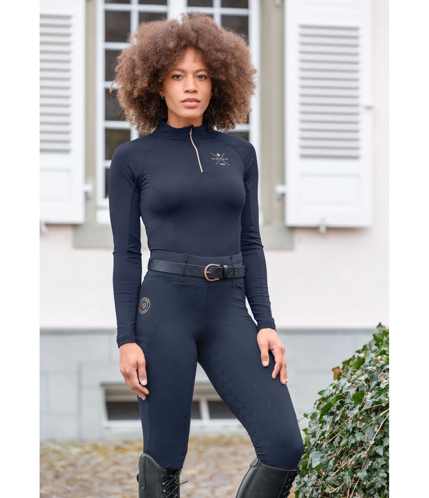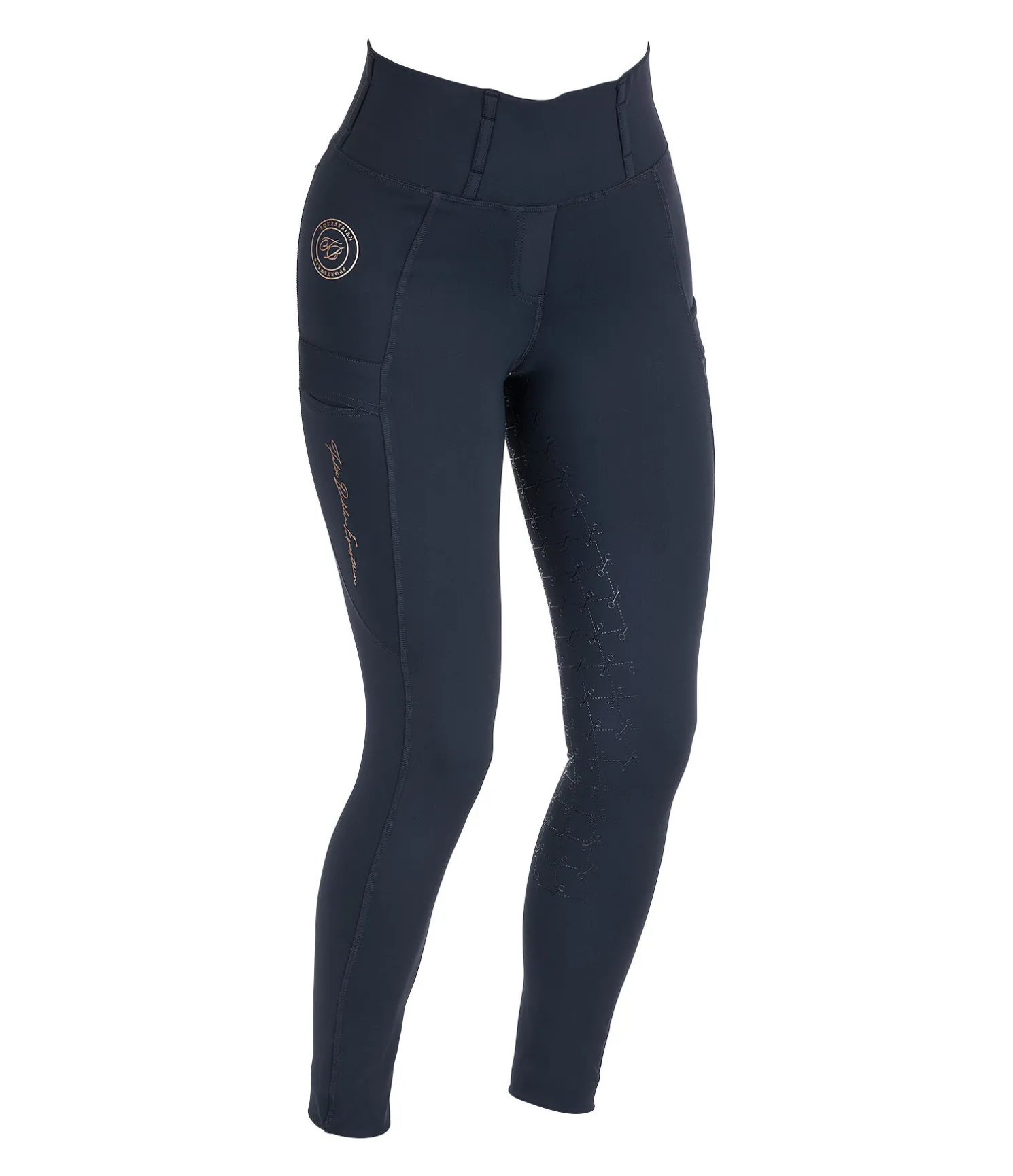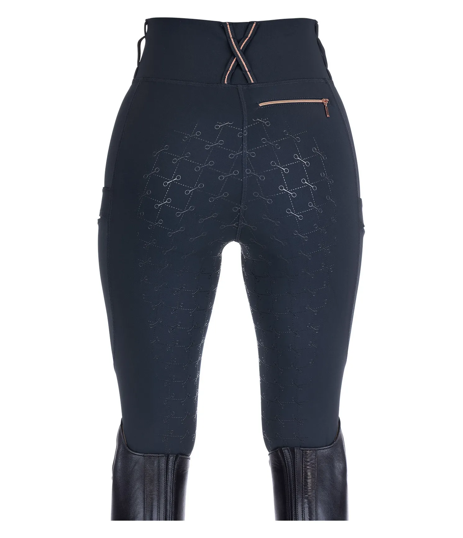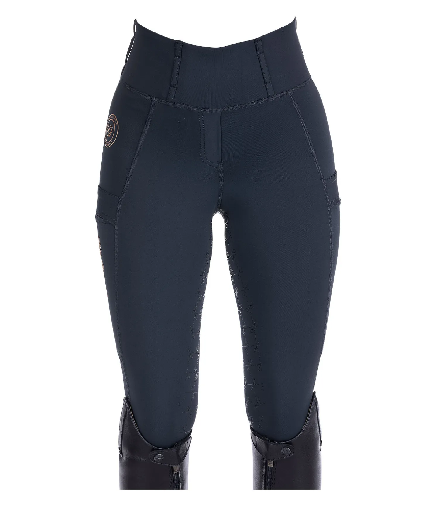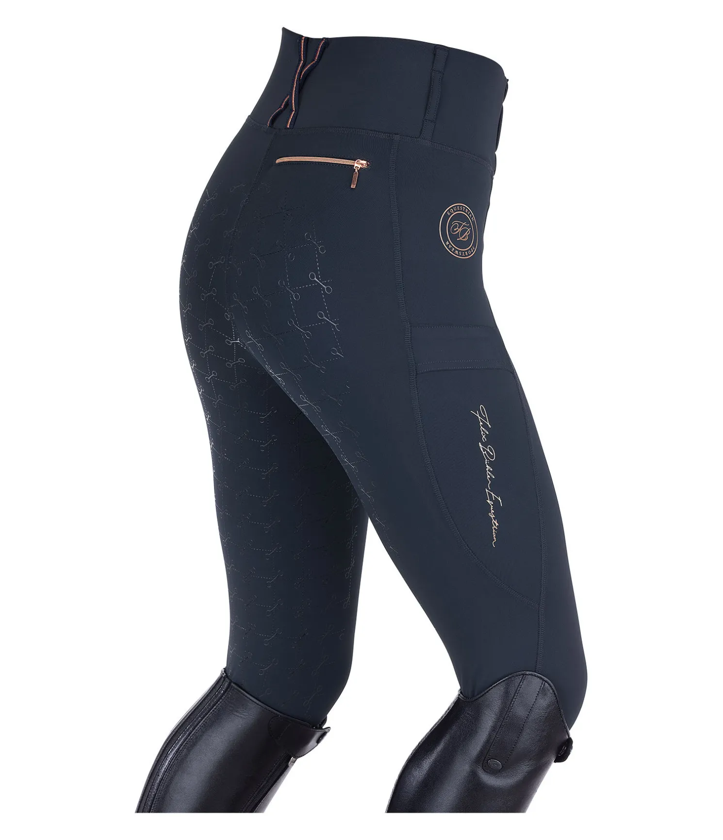Legging d’équitation confortable à fond intégral grip en silicone avec motifs de mors. Matière respirante de grande qualité, extensible dans 4 directions. Séchage rapide. Soutien parfait et coupe ajustée. Ceinture extra large avec passants. 1 poche arrière zippée et 2 poches latérales pour téléphone portable. Aucune couture au niveau des genoux. Bas de jambe extensible. Imprimés Felix Bühler pailletés. 78 % polyester, 22 % élasthanne.