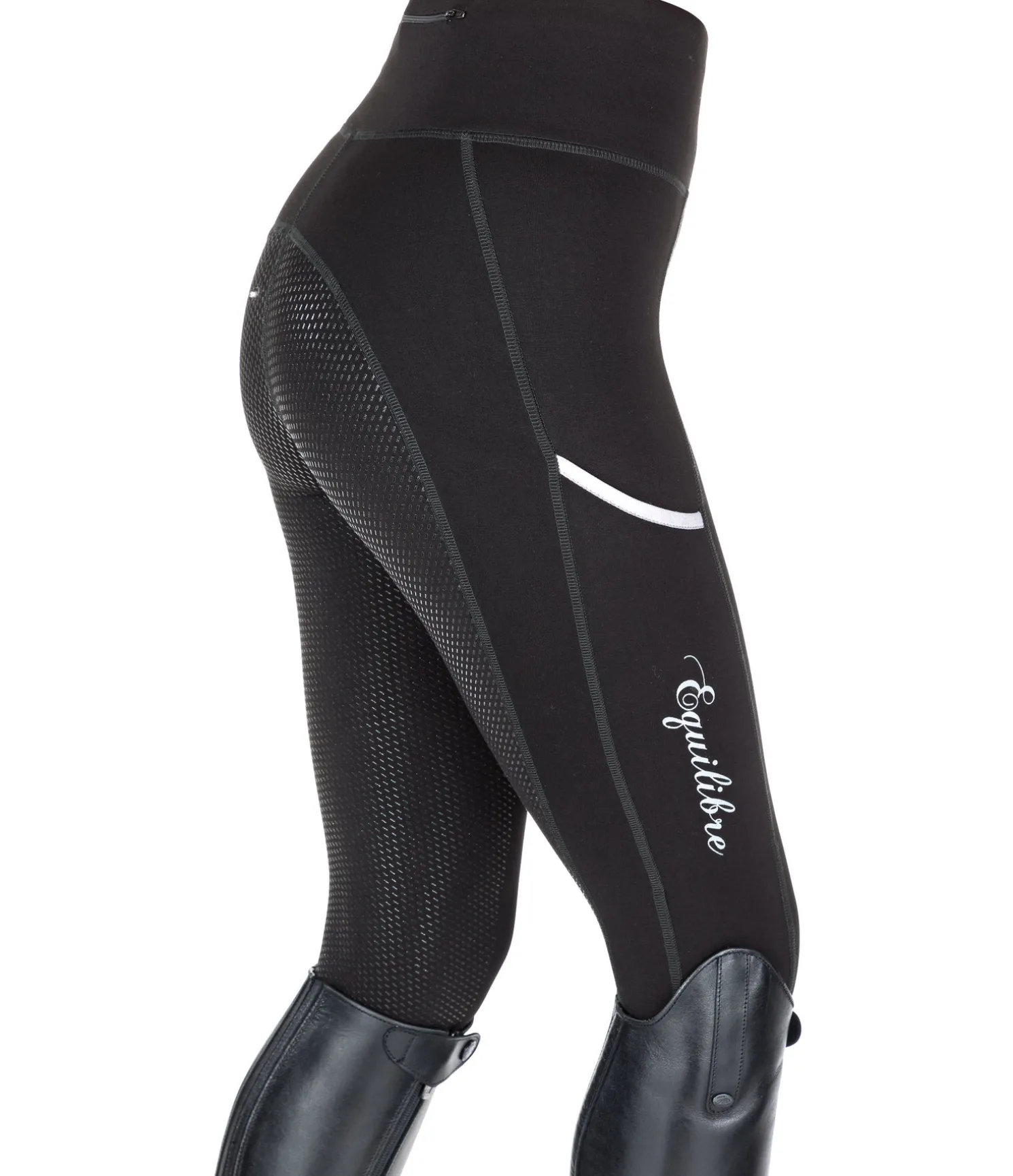 Legging d’équitation extrêmement confortable avec fond intégral grip en silicone. Stretch très doux et extensible dans 4 directions. Ceinture extra large. 1 poche zippée arrière et 1 poche pour téléphone portable sur la cuisse. Aucune couture au niveau des genoux. Bas de jambe extensible sans patte auto-agrippante. 68 % viscose, 27 % nylon, 5 % élasthanne.