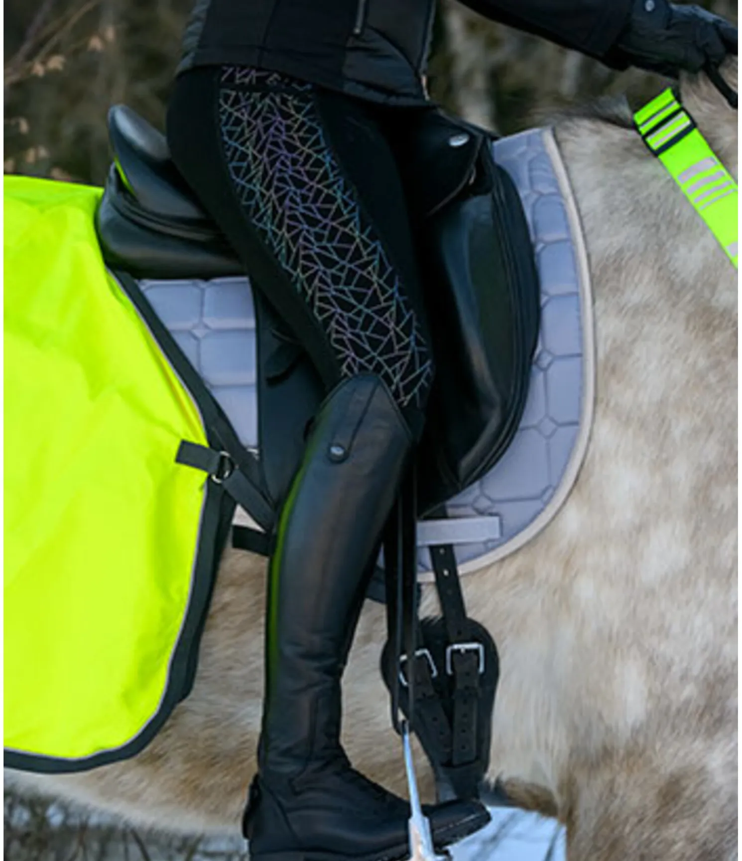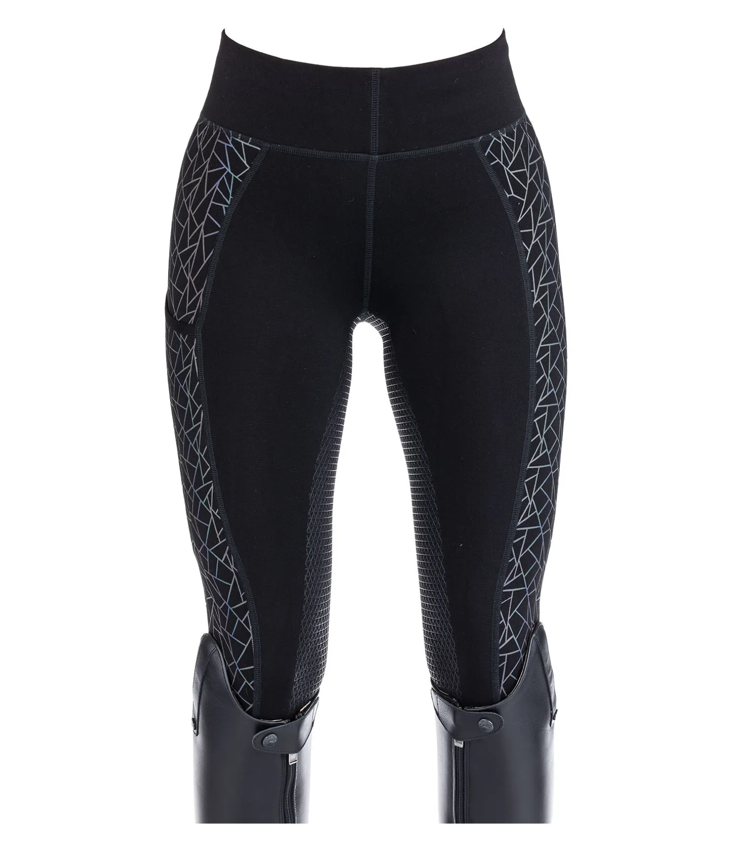 Legging d’équitation taille haute. Fond intégral grip. En matière élastique confortable et respirante. Imprimé géométrique holographique réfléchissant aux couleurs de l’arc-en-ciel à l’extérieur de la jambe. Poche latérale pour le téléphone portable sur la cuisse. Petite poche zippée à l’arrière du pantalon. Ceinture large pour un confort optimal. 68 % viscose, 28 % nylon, 4 % élasthanne.