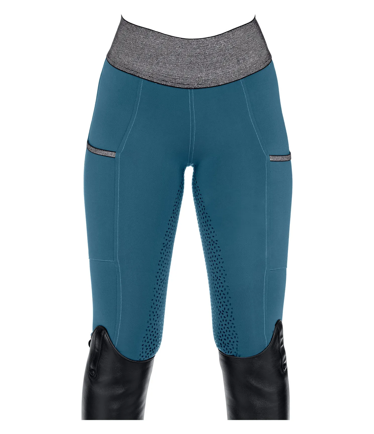 Legging d’équitation sportswear à fond intégral grip siliconé. Matière stretch respirante, extensible dans 4 directions et ultra confortable. Ceinture pailletée élastiquée. Poche latérale pour téléphone portable. 68 % viscose, 27 % polyamide, 5 % élasthanne.