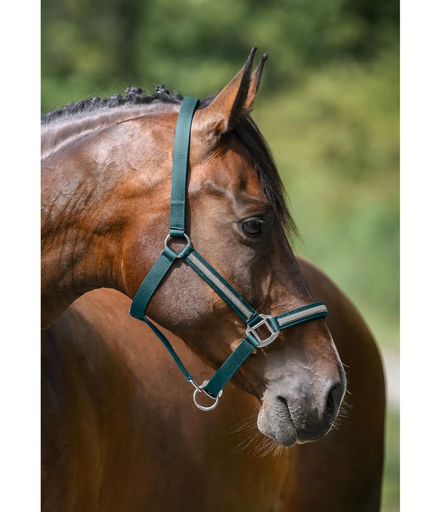 Licol tendance avec bande scintillante cousue. Têtière et muserolle avec doublure douce en caoutchouc chloroprène. Têtière et muserolle réglables. 100 % polypropylène.