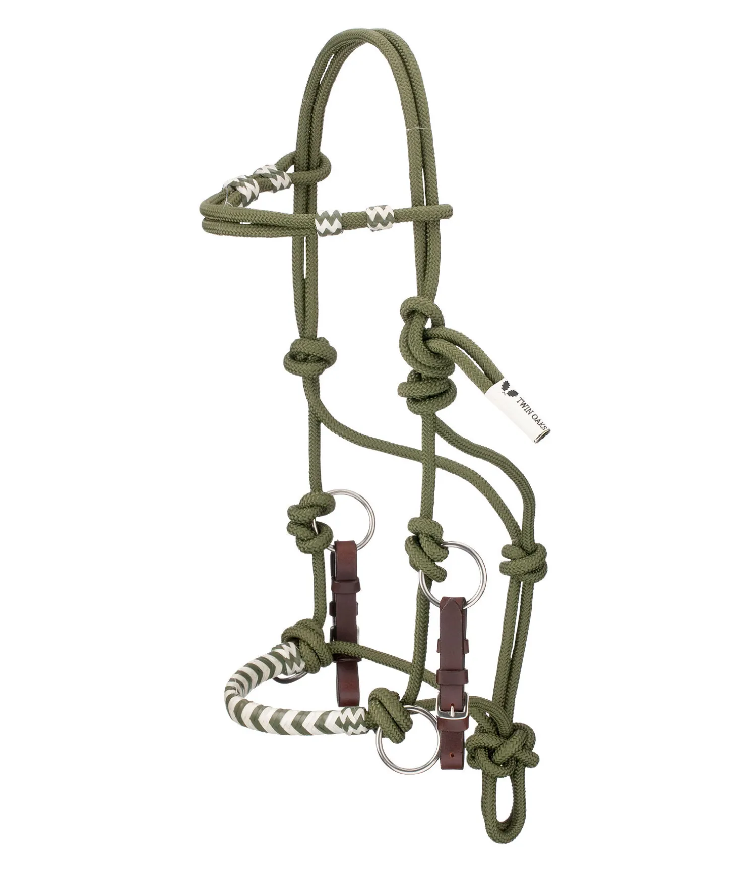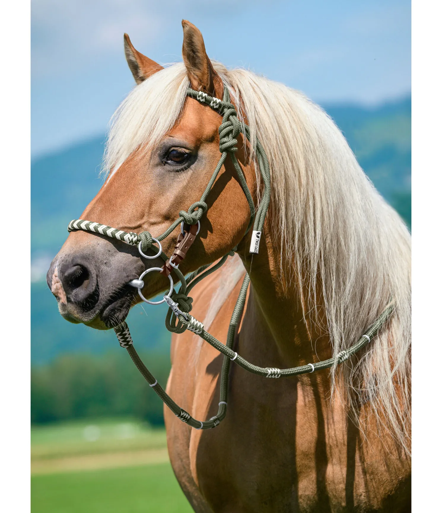 « Bridon – licol à noeuds » innovant disposant de 3 fonctionnalités différentes et d’un joli look cuir brut. Utilisable en licol pour le travail au sol ou en bridon avec ou sans mors. Possibilité de fixer en un tour de main un mors ou un hackamore grâce aux montants en cuir sur les côtés. Rênes assorties incluses avec jolie décoration cuir brut !