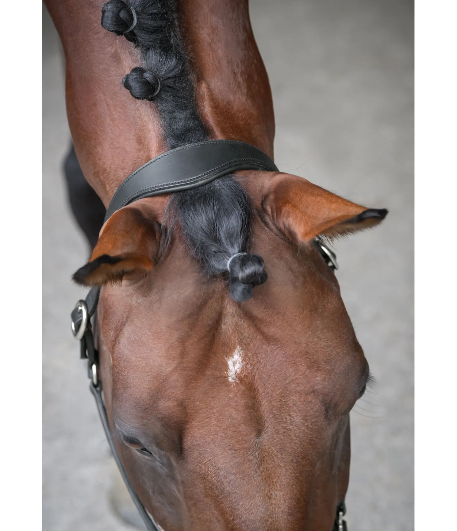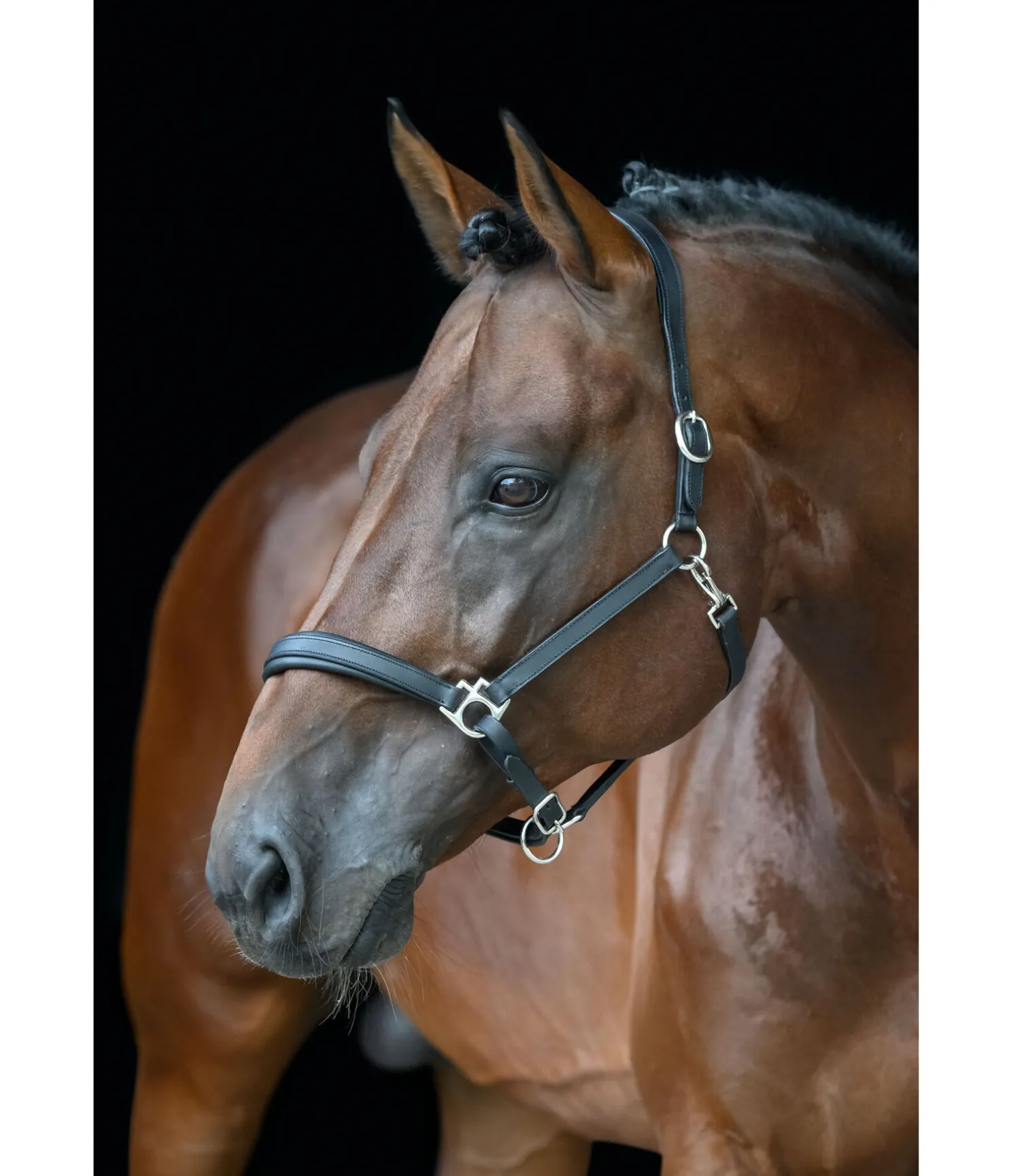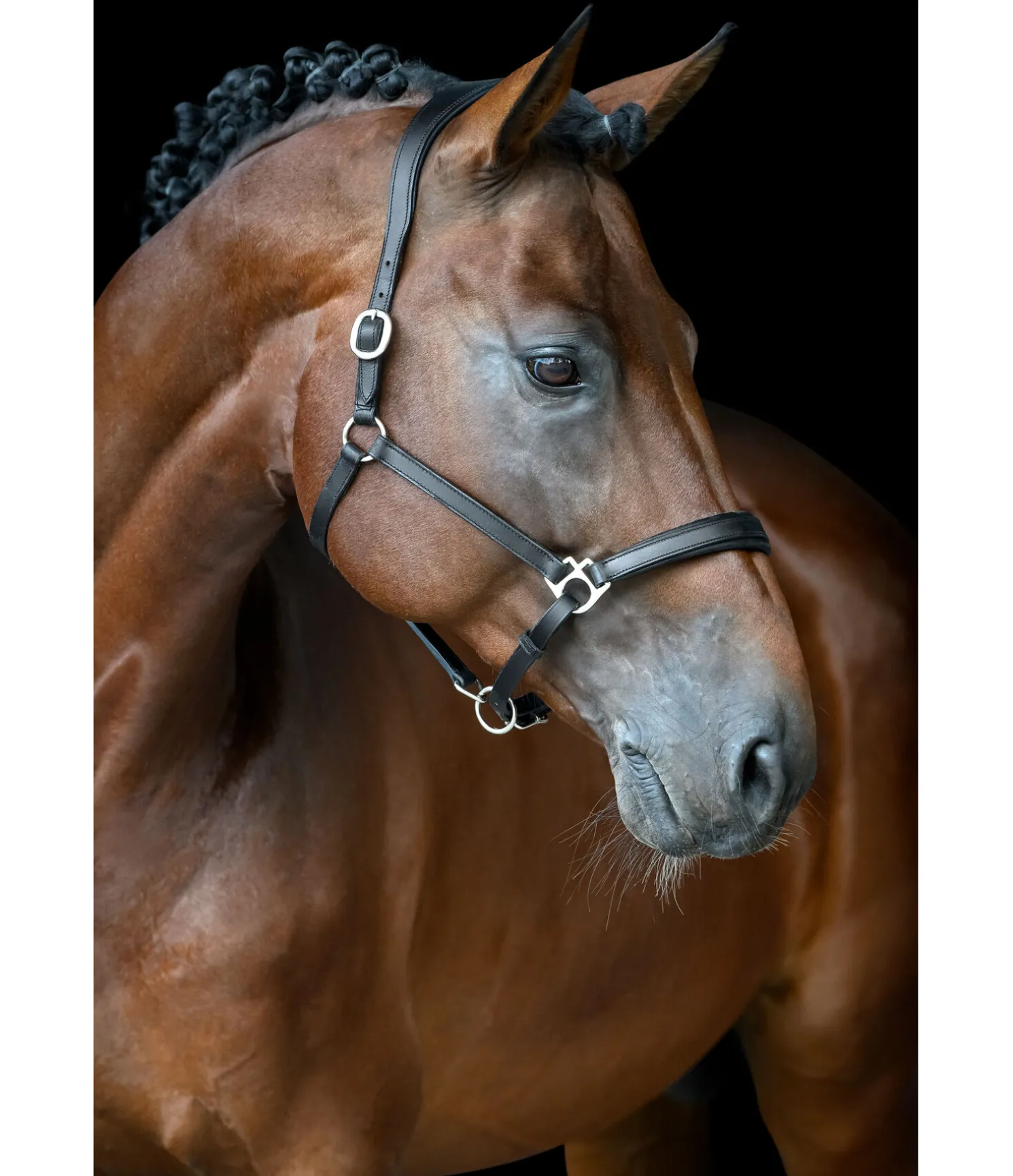 Licol de forme anatomique en cuir gras avec doublure douce en cuir à la têtière et la muserolle. Gaufrage logo discret sur la têtière. Têtière et muserolle réglables. Bouclerie argentée.