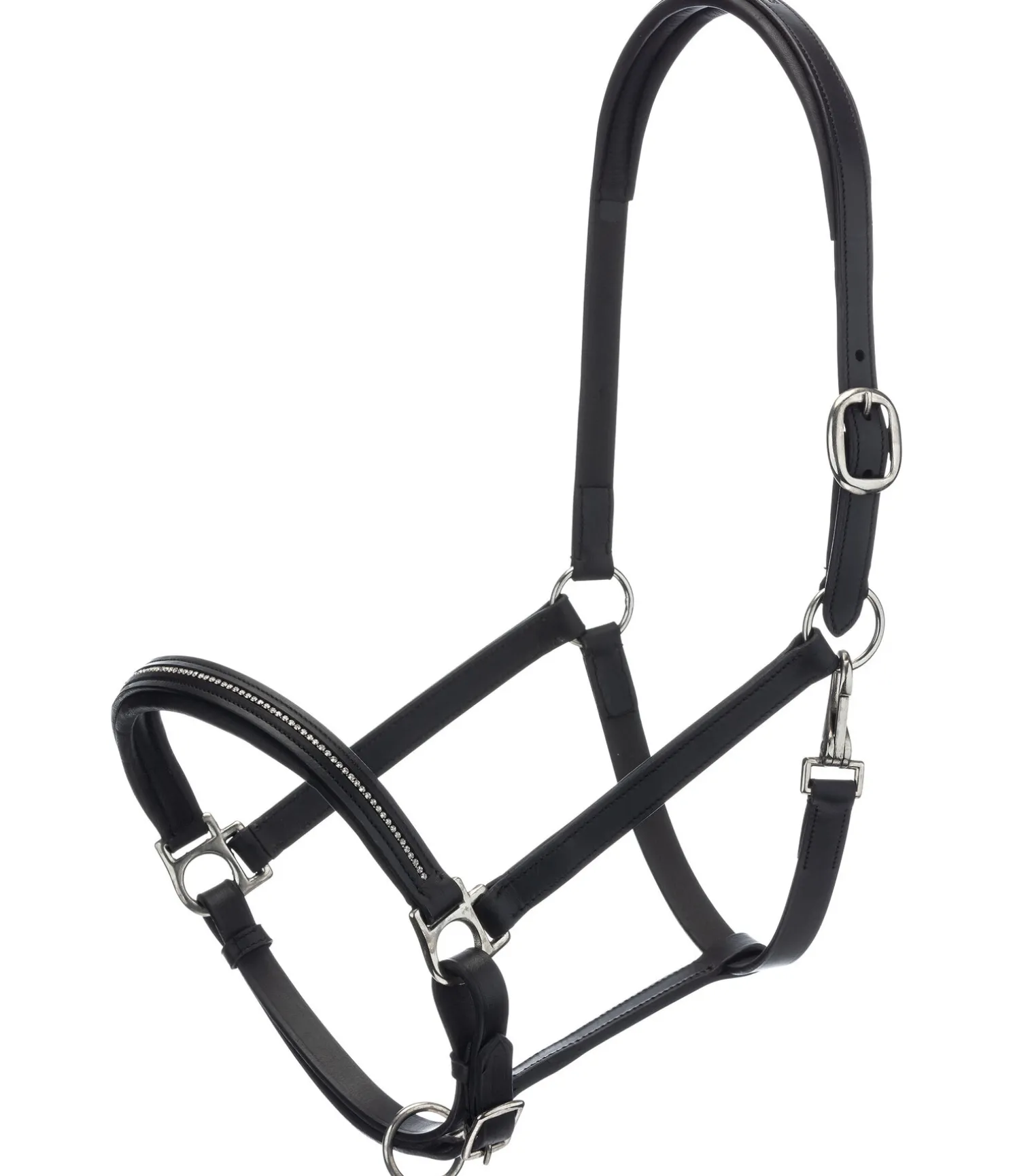 Licol en cuir gras orné d’une rangée de petits strass blancs discrets sur la muserolle. Doublure moelleuse en cuir véritable à la muserolle et la têtière pour un confort optimal. Têtière et muserolle facilement réglables. Bouclerie argentée.