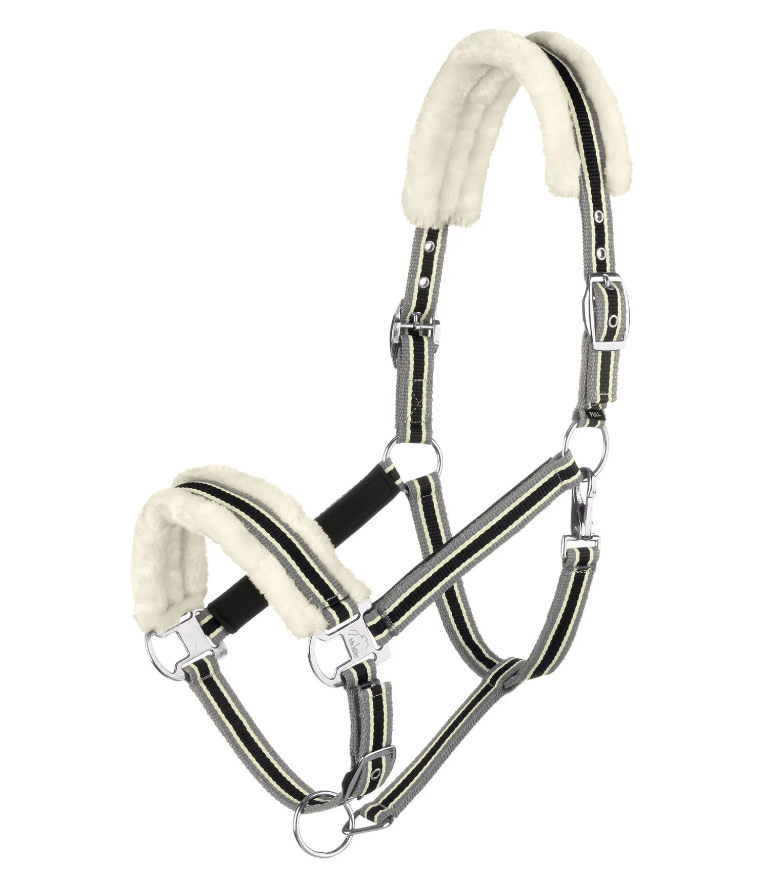 Licol sportswear avec doublure en polaire Teddy douce sur la têtière et muserolle et en caoutchouc-chloroprène moelleux sur les montants. Design tricolore tendance. Têtière doublement réglable et muserolle réglable. Bouclerie en métal de couleur assortie. Licol 100 % polypropylène, polaire Teddy 100 % polyester.