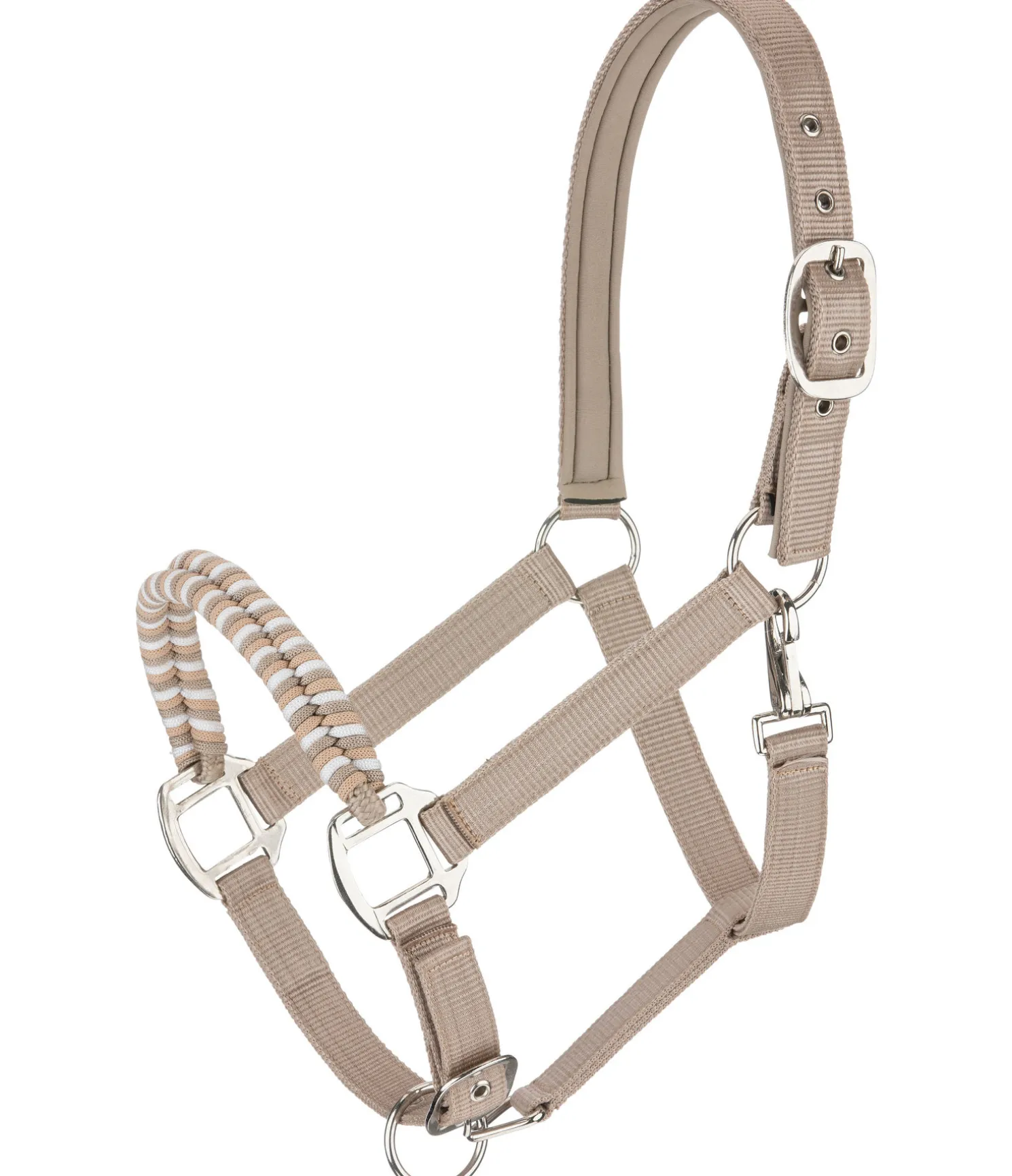 Licol exceptionnel avec muserolle tressée dans un look tricolore et broderie logo sur la têtière. Muserolle et têtière réglables. Têtière avec doublure moelleuse en caoutchouc chloroprène.