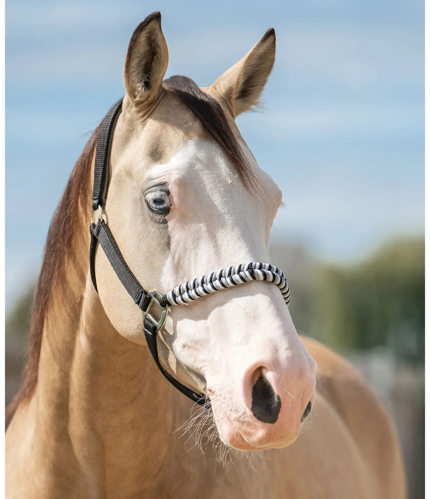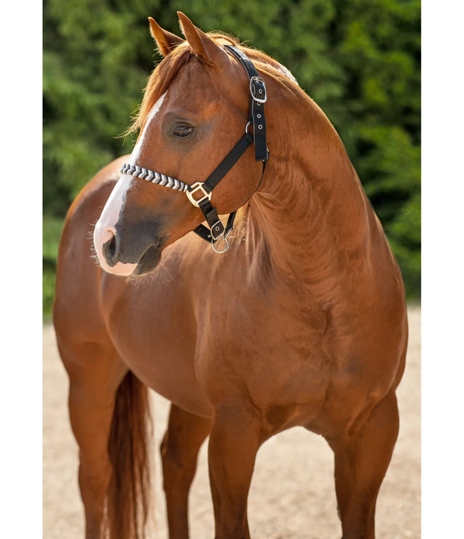 Licol exceptionnel avec muserolle tressée dans un look tricolore et broderie logo sur la têtière. Muserolle et têtière réglables. Têtière avec doublure moelleuse en caoutchouc chloroprène.