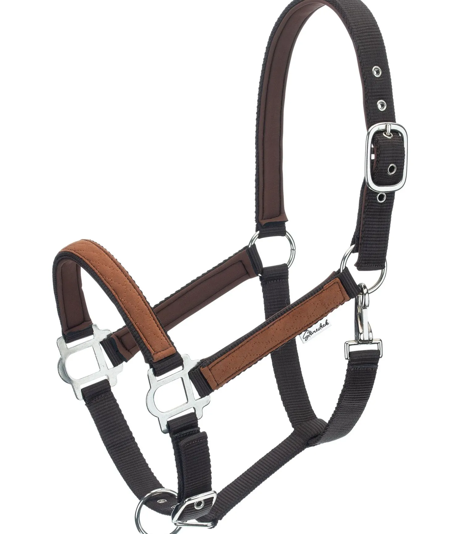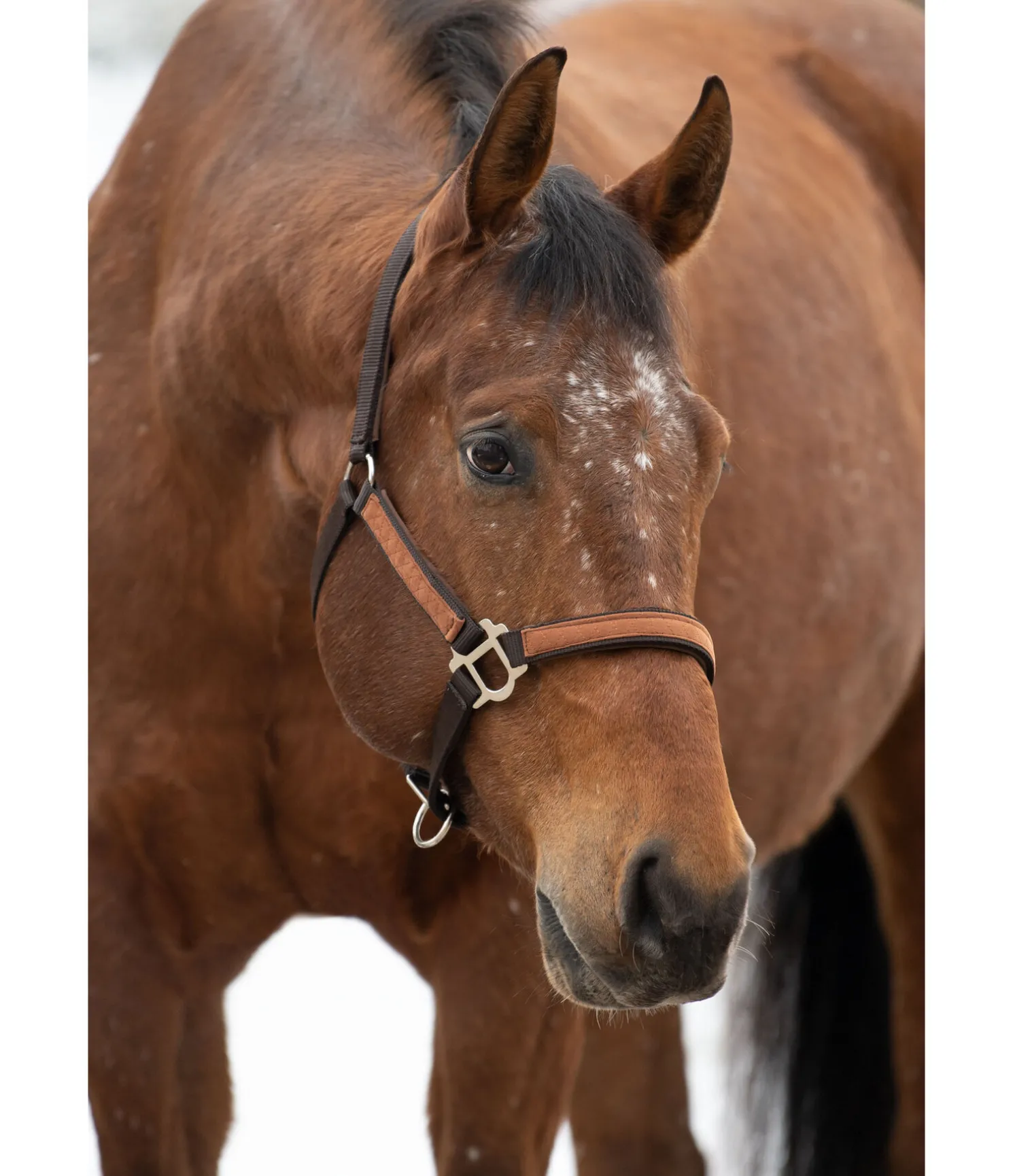 Licol chic dans un look western avec montants et muserolle ornés de suédine. Têtière, montants et muserolle avec doublure moelleuse en caoutchouc chloroprène. Têtière et muserolle réglables. Mousquetons clippers. Boucles argentées. Licol 50 % polypropylène, 50 % polyester, doublure 100 % caoutchouc chloroprène.
