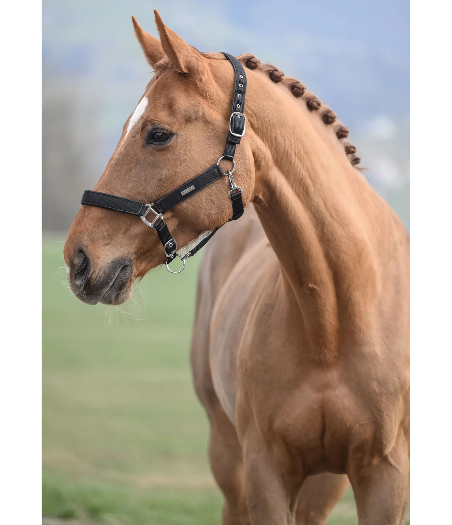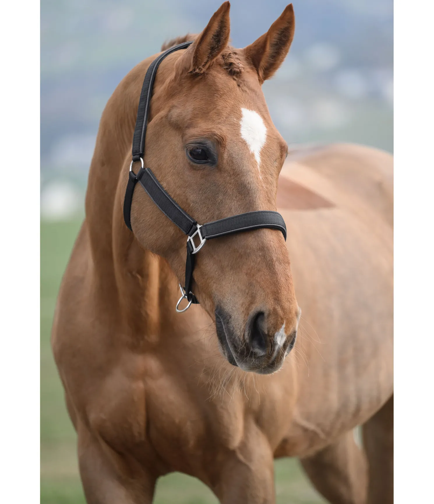 Licol chic avec passepoil scintillant et bouclerie de couleur assortie. Têtière, muserolle et montants avec doublure douce en caoutchouc chloroprène pour un confort maximal. Plaque métallique discrète avec logo gravé sur le montant gauche. Têtière et muserolle réglables. 100 % polypropylène.
