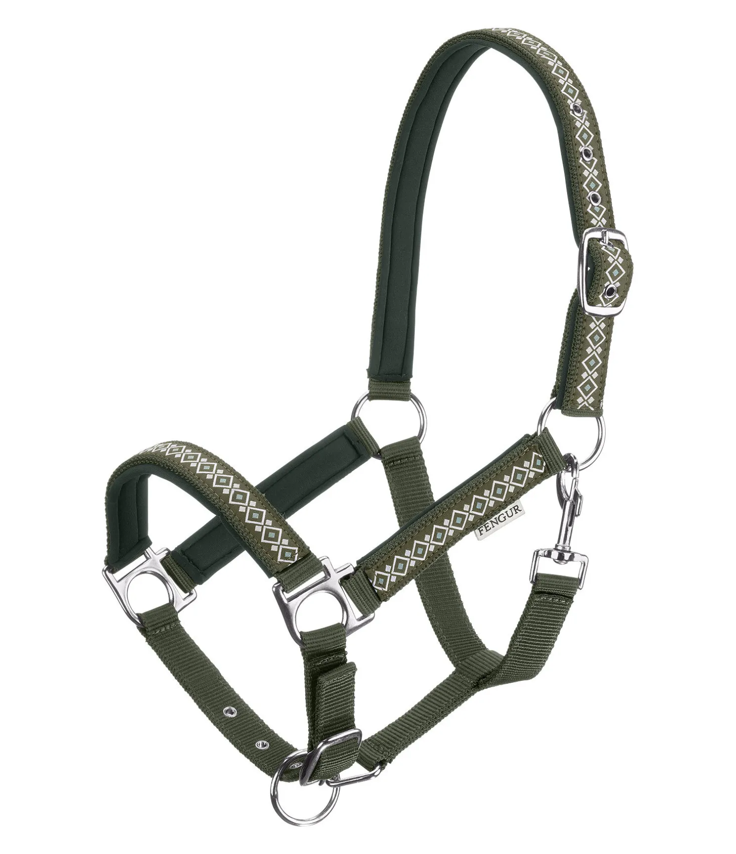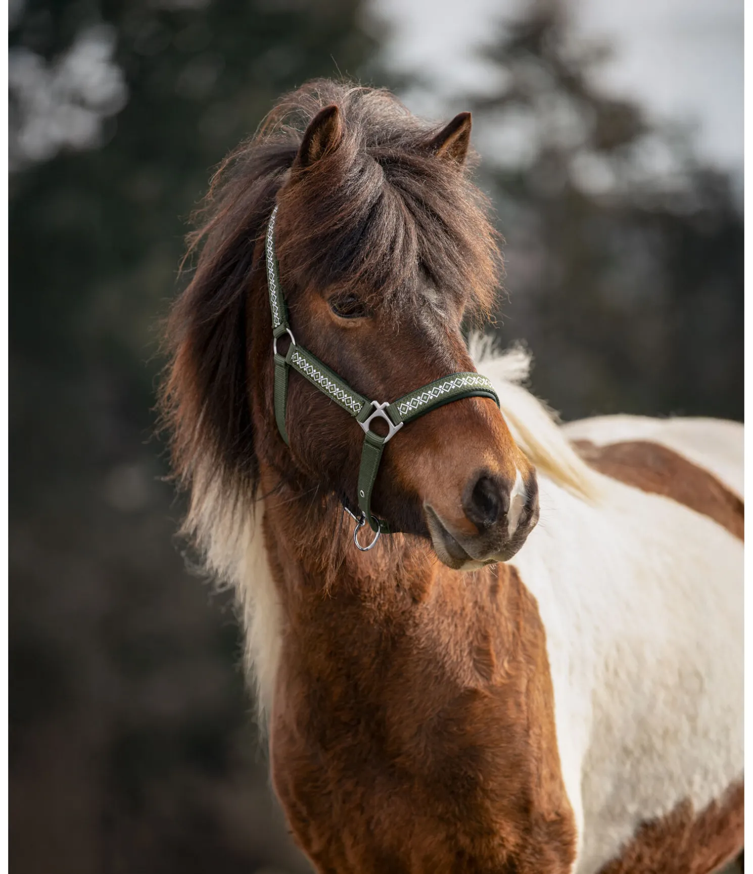 Licol avec motif nordique, pas uniquement réservé aux poneys islandais. Têtière, montants et muserolle avec doublure moelleuse. Têtière et muserolle réglables. Licol 100 % polypropylène, doublure 100 % polyester