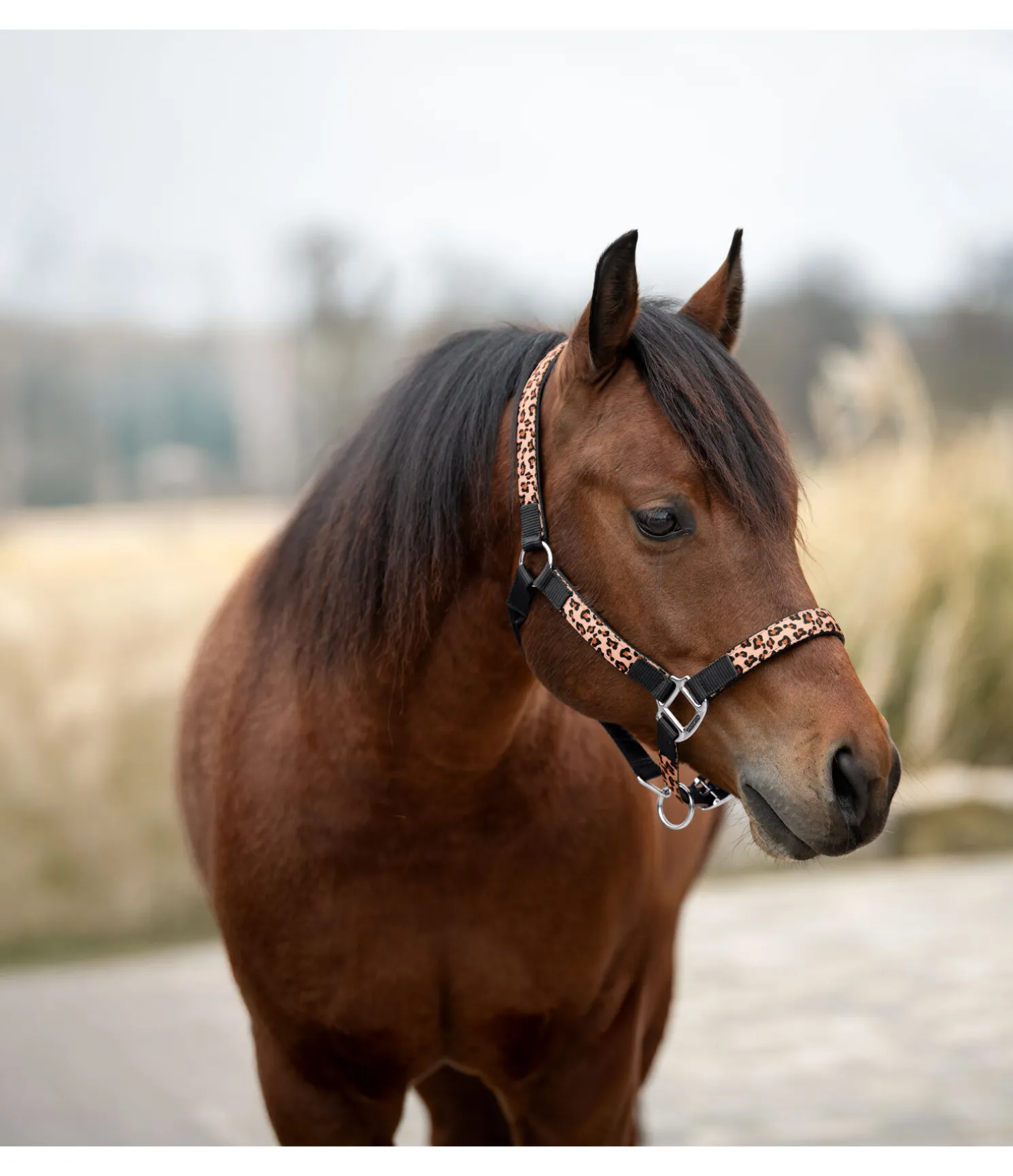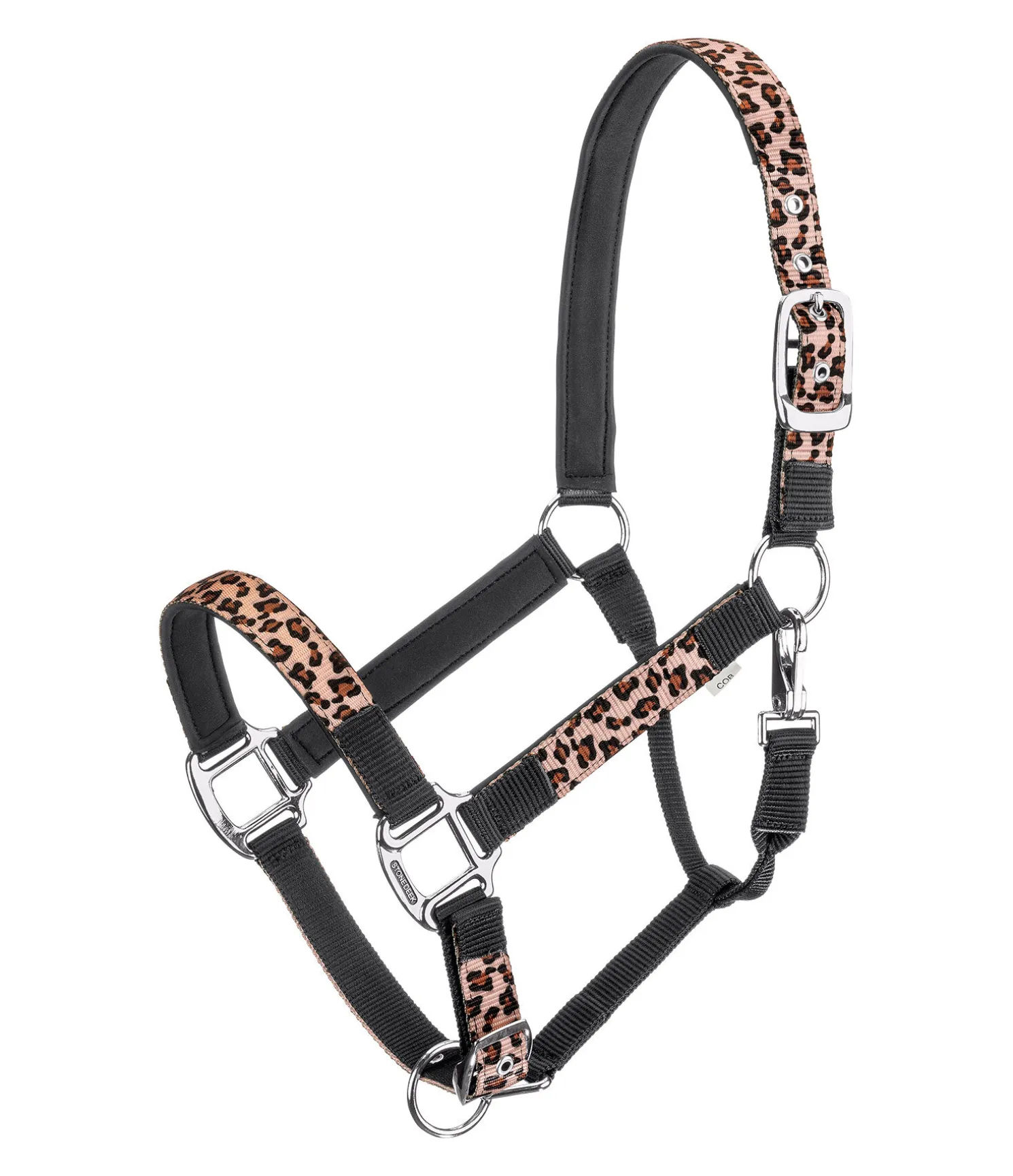 Licol de qualité supérieure au look léopard ! Avec rembourrage doux en caoutchouc chloroprène au niveau de la têtière, de la muserolle et des montants. Têtière et muserolle réglables. Bouclerie argentée robuste. 100 % polypropylène.