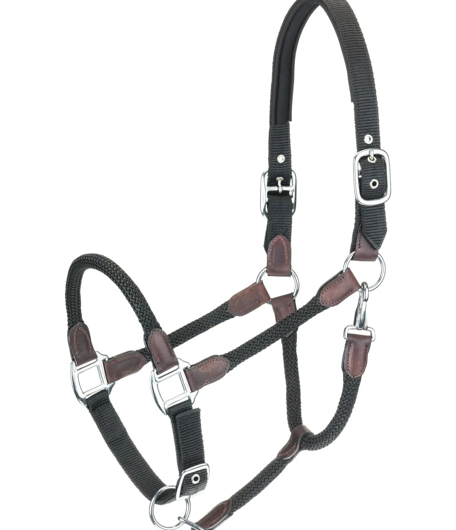 Licol exceptionnel avec corde tressée et extrêmités en cuir, qui lui confèrent un look particulièrement soigné. Assorti à la longe Kate (440 543 et 440 686). Muserolle et têtière réglables. Bouclerie argentée. Licol 100 % polypropylène, doublure 100 % caoutchouc chloroprène.