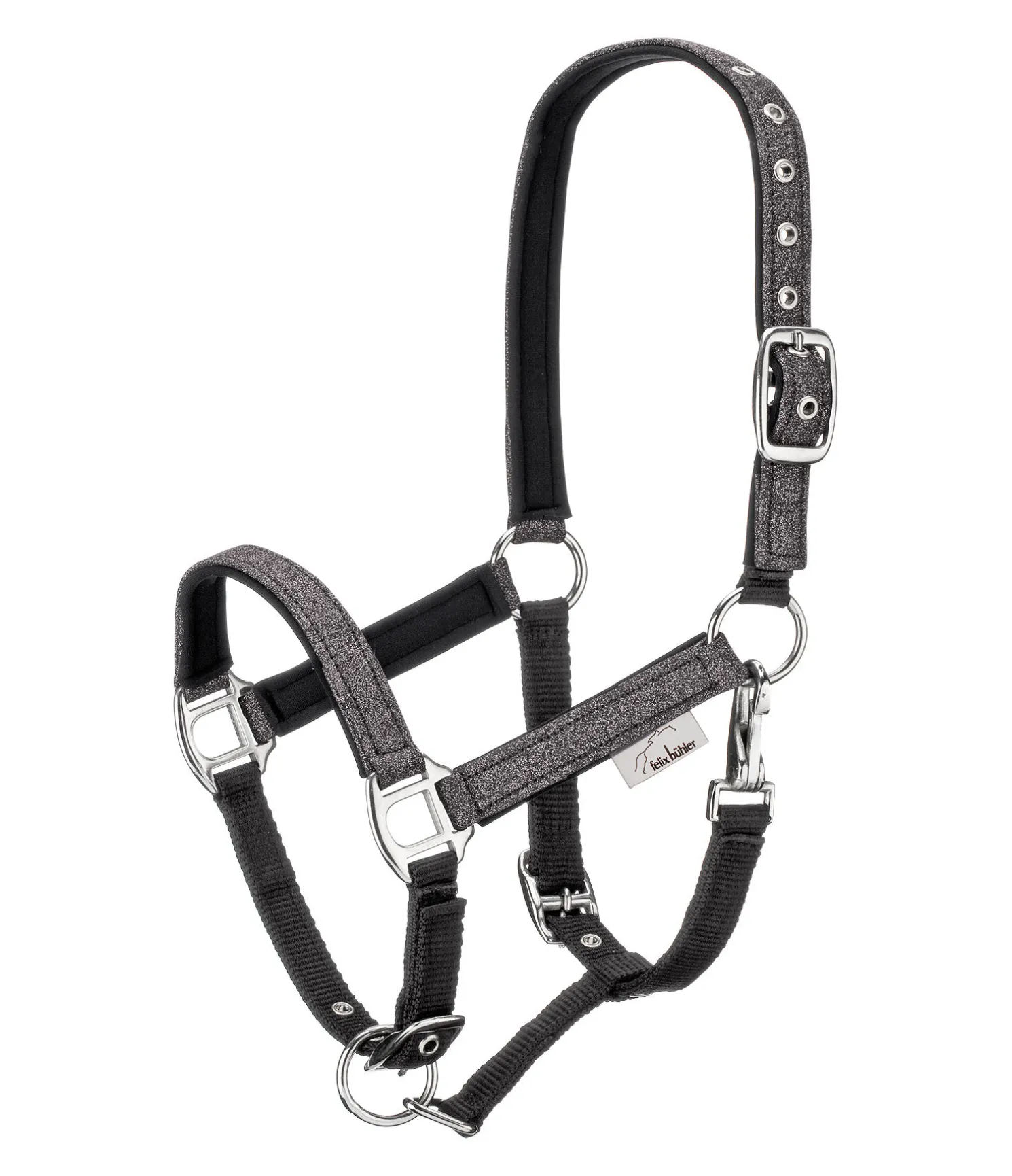 Licol pailleté étincelant avec doublure douce en caoutchouc chloroprène sur la têtière, la muserolle et les montants. Têtière et muserolle faciles à régler. Licol 100 % polypropylène.