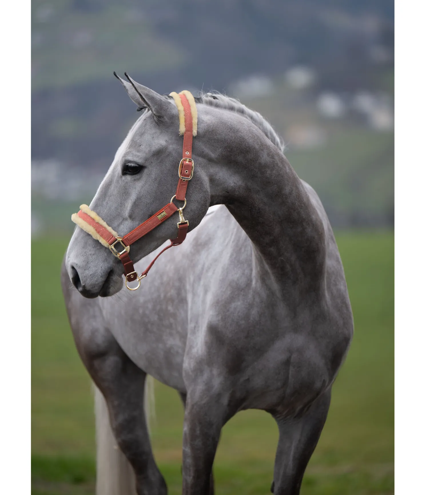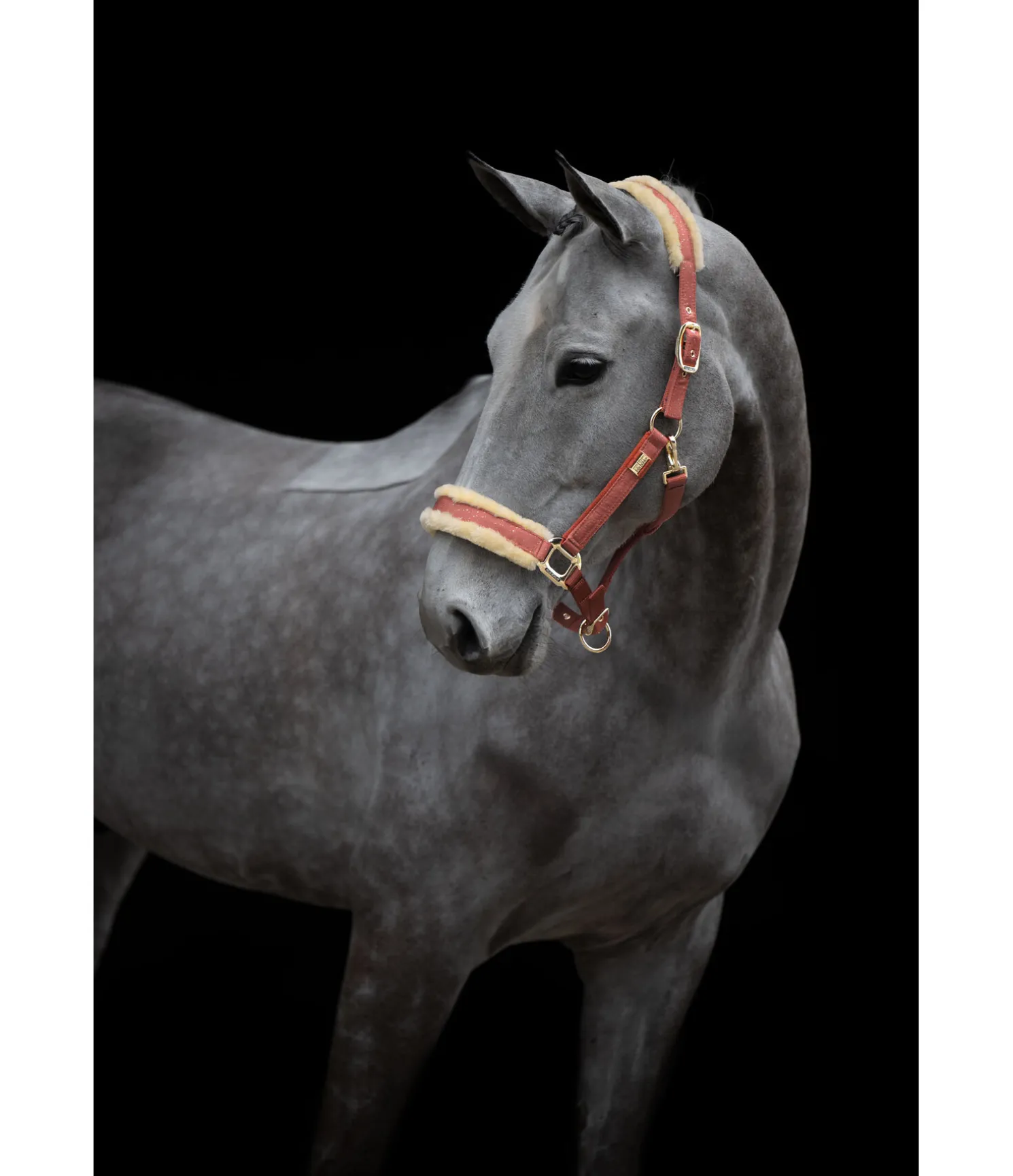 Magnifique licol avec revêtement satiné orné de fragments scintillants et bouclerie de couleur assortie. Têtière et muserolle avec doublure douce en polaire Teddy. Petite plaque élégante avec logo gravé sur chaque montant. Têtière doublement réglable et muserolle réglable. Licol 100 % polypropylène, doublure et revêtement 100 % polyester.