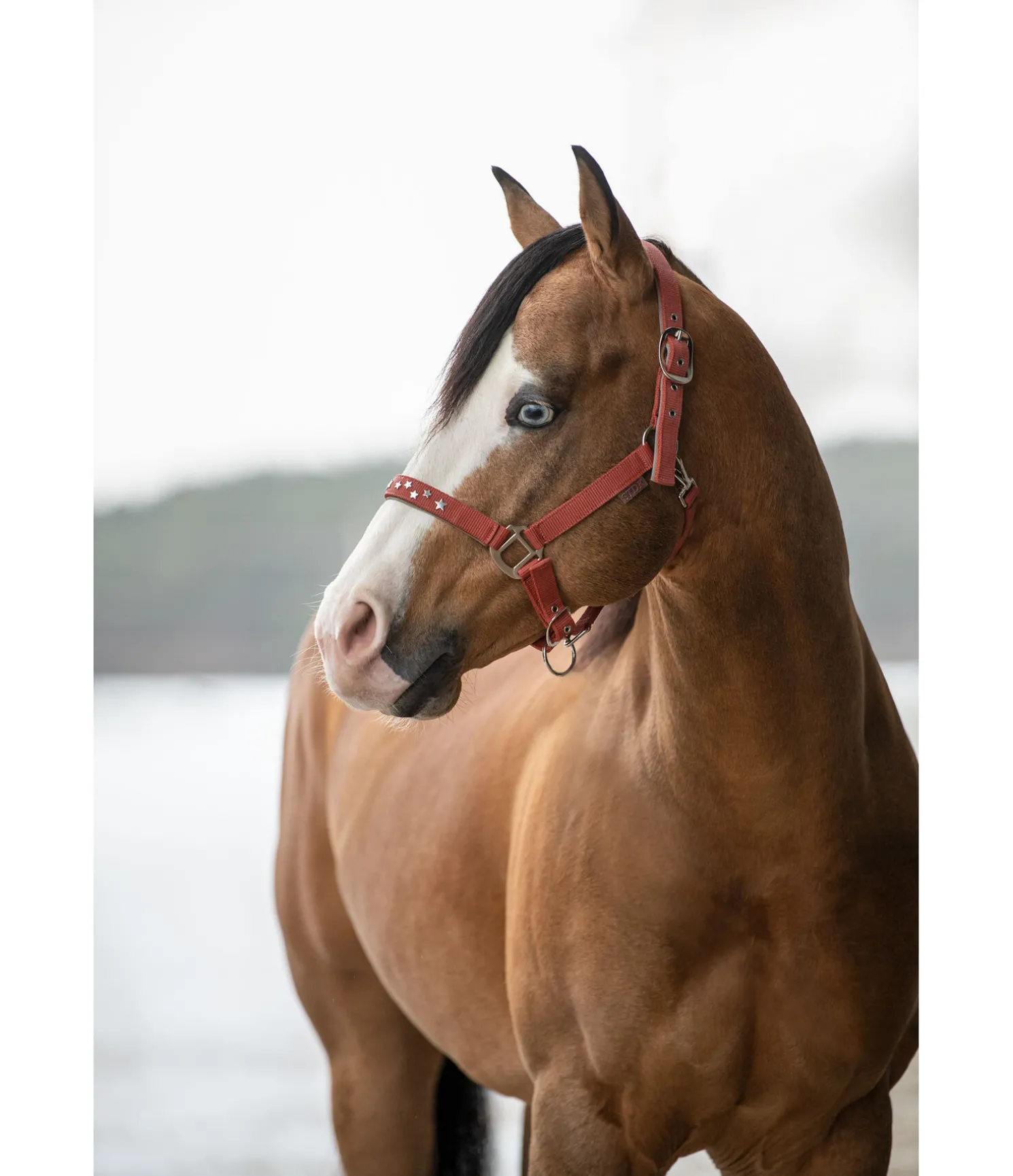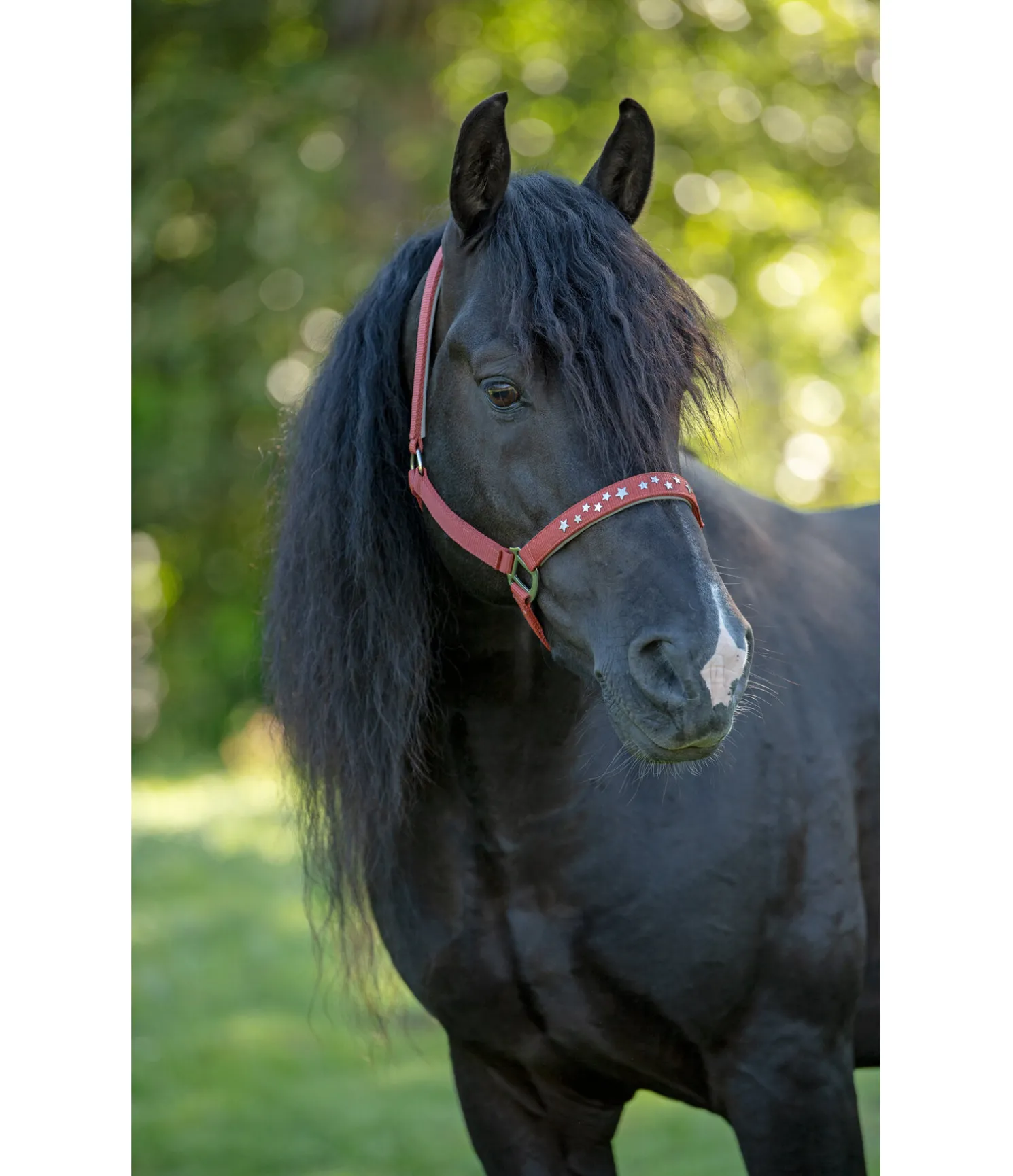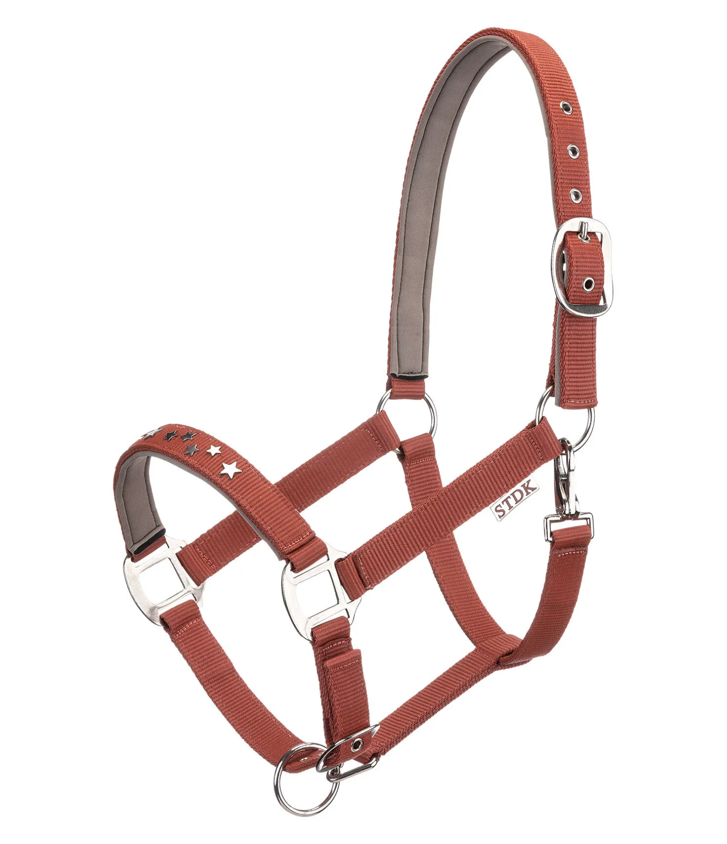 Licol orné de petites étoiles en métal sur la muserolle. Doublure douce en caoutchouc chloroprène sur la têtière et la muserolle. Têtière et muserolle réglables.