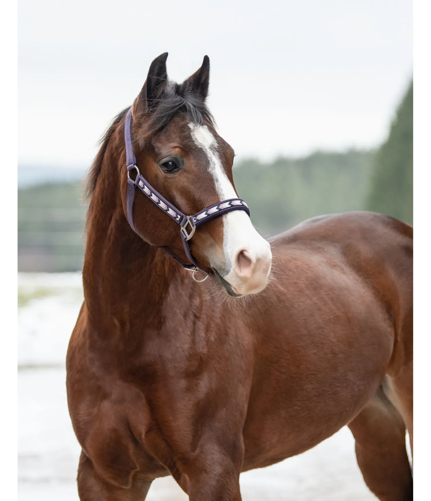 Licol en nylon avec décoration sophistiquée en perles. Rembourrage doux sur la muserolle et la têtière. Muserolle et têtière réglables.