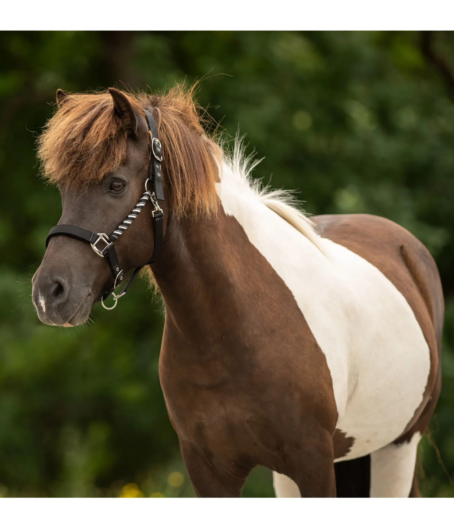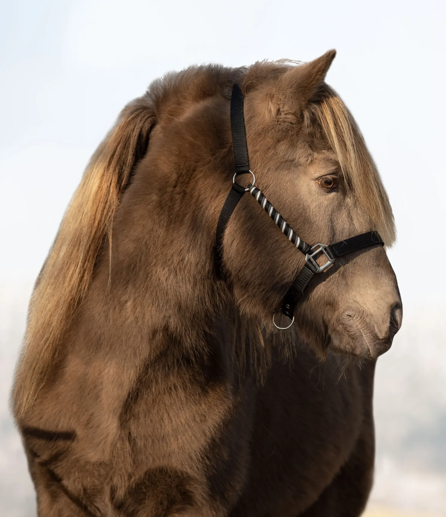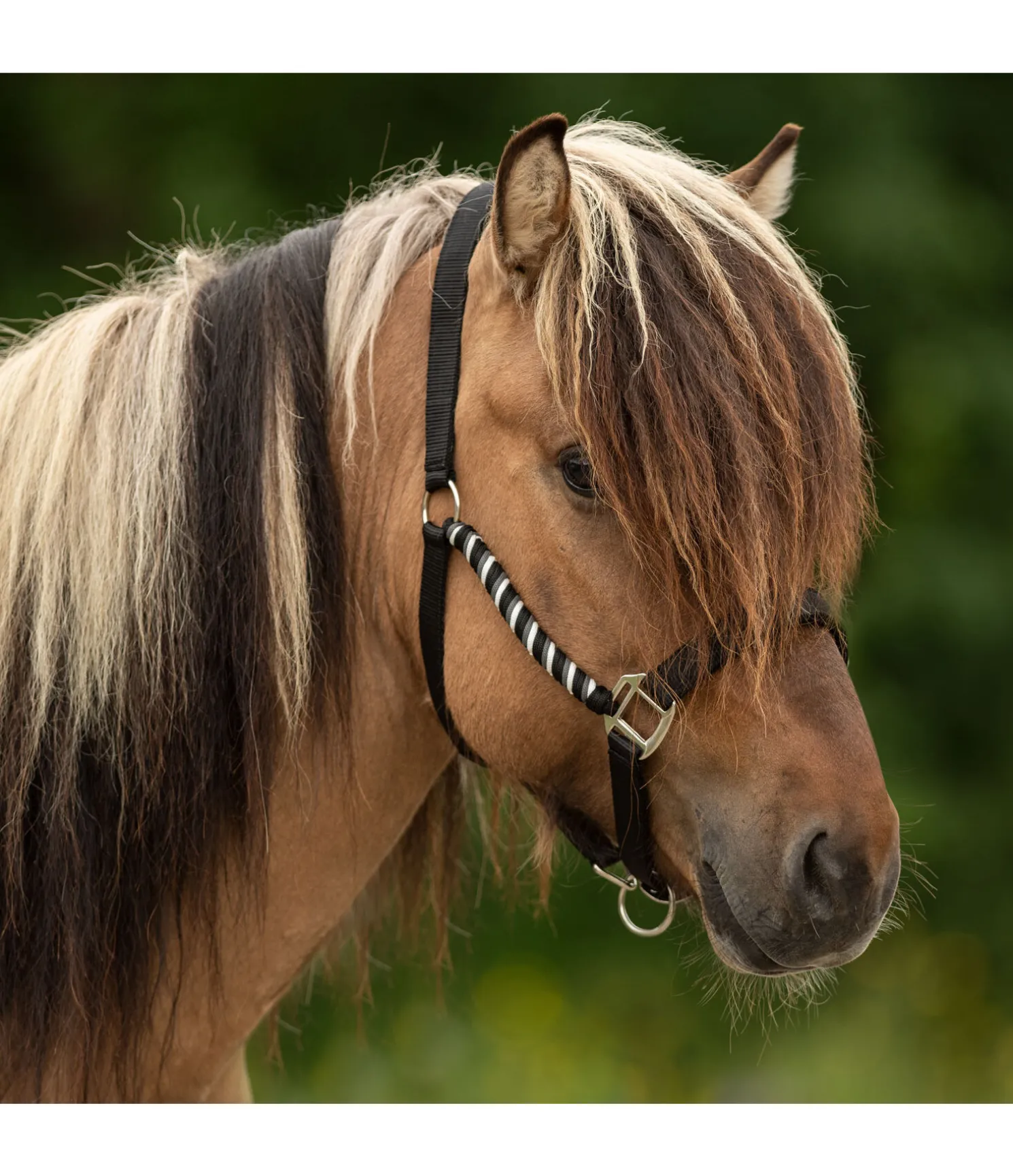 Licol hors du commun avec montants tressés et doublure moelleuse en caoutchouc chloroprène. Têtière et muserolle réglables. Bouclerie argentée.