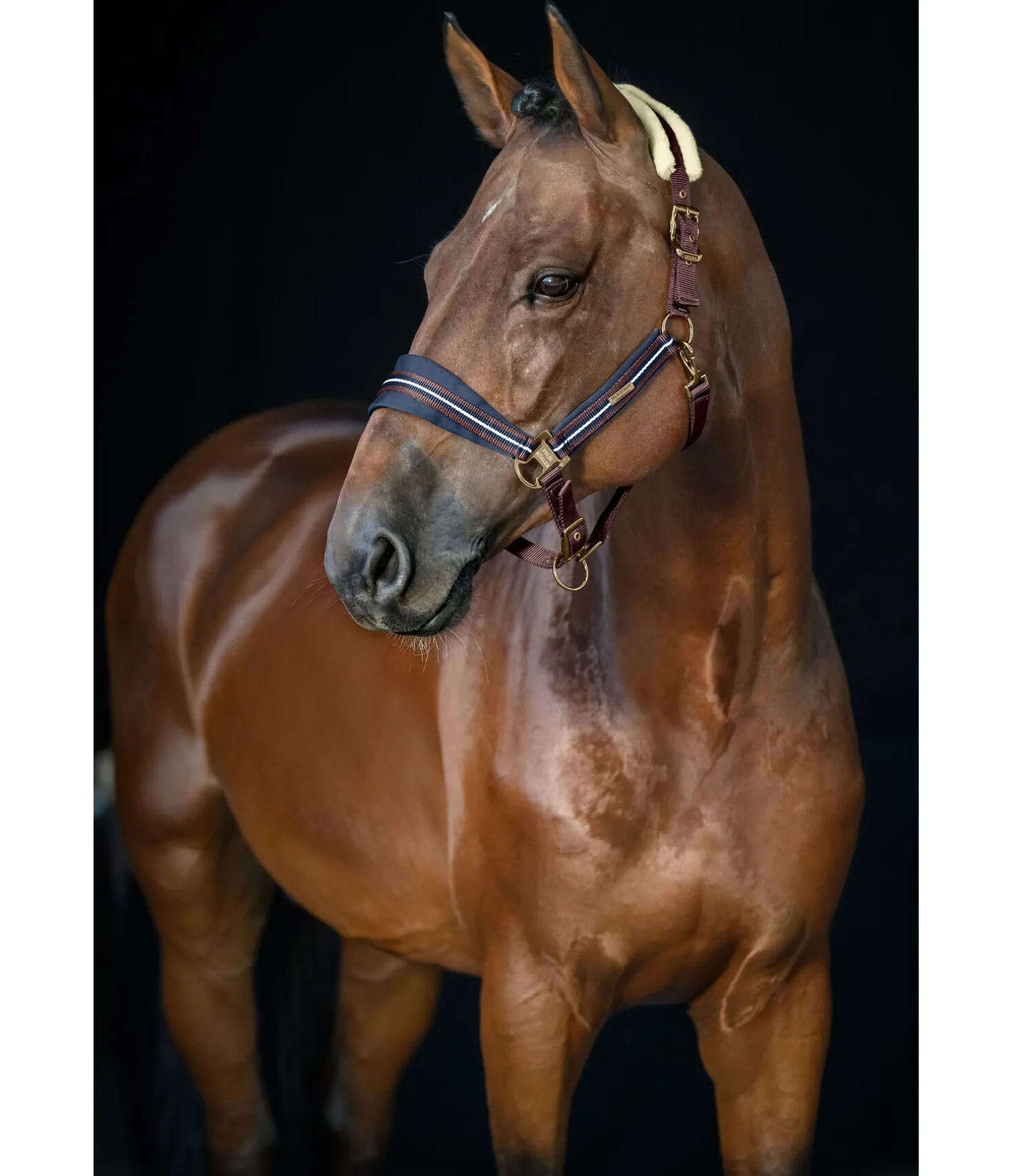 Licol avec têtière doublée en polaire Teddy douce. Sportswear. Muserolle et montants doublés en caoutchouc-chloroprène doux. Design tendance à rayures tricolore orné d’une petite plaque avec logo. Têtière doublement réglable et muserolle réglable. Bouclerie en métal de couleur assortie. Licol 100 % polypropylène, polaire Teddy 100 % polyester.