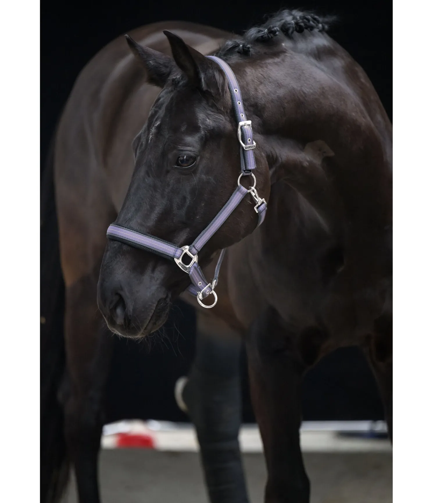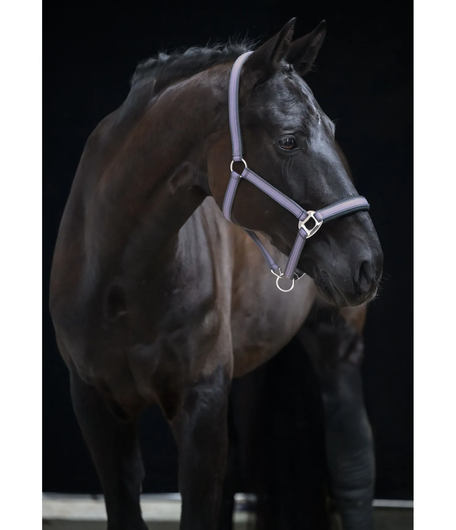 Licol rayé dans un look sportif avec doublure respirante en mesh sur la têtière et la muserolle. Muserolle et têtière réglables. Licol 100 % polypropylène.