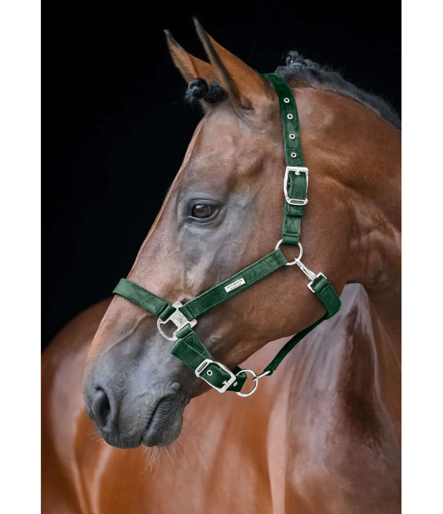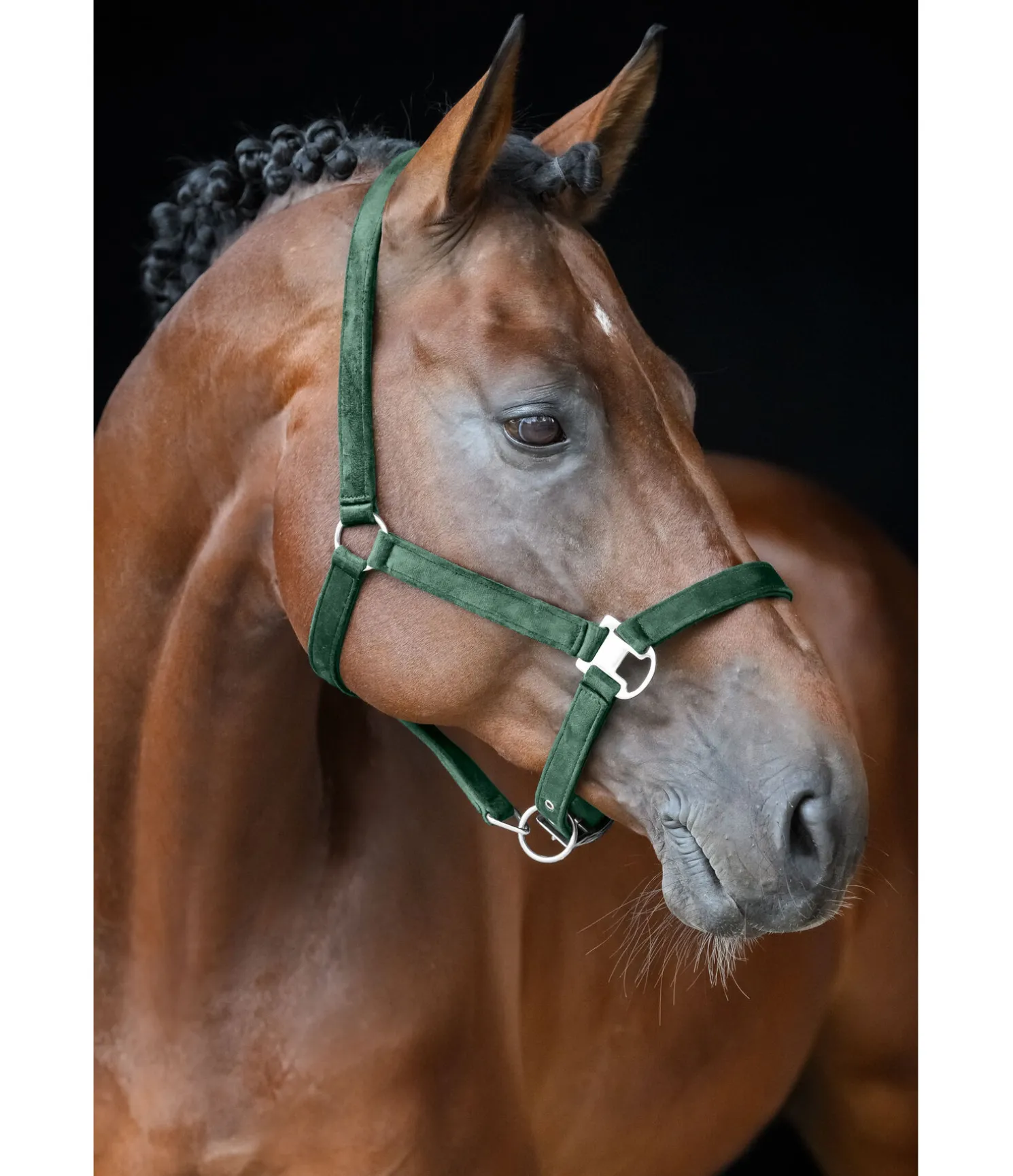 Élégant licol entièrement doublé en matière satinée. Avec plaque logo métallique brillante. Têtière et muserolle réglables. 100 % polypropylène.