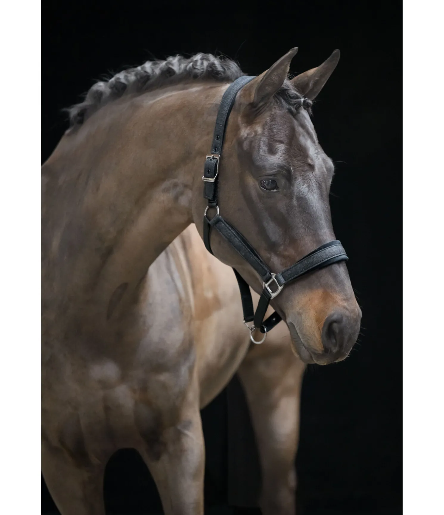 Licol pailleté. Doublure douce effet velours au niveau de la têtière, de la muserolle et des montants. Têtière réglable sur chaque côté. Muserolle réglable. Bouclerie de couleur assortie. 100 % polypropylène.