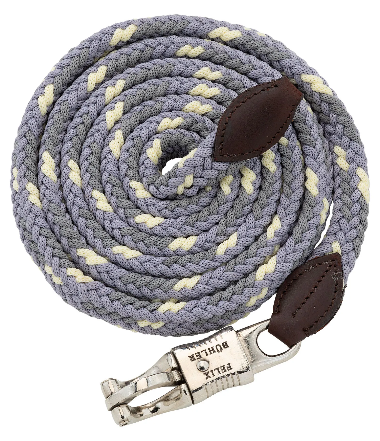 Longe tressée très résistante avec élégants embouts en cuir et mousqueton anti-panique. Assortie au licol 310040. Bouclerie argentée. 2 m. 100 % polypropylène.