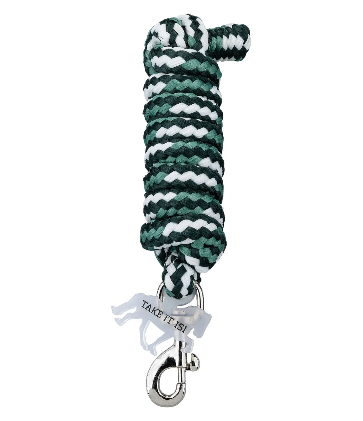 Longe longue avec mousqueton tressée de plusieurs couleurs. Médaillon en caoutchouc avec logo. Bouclerie argentée. 100 % polyester.