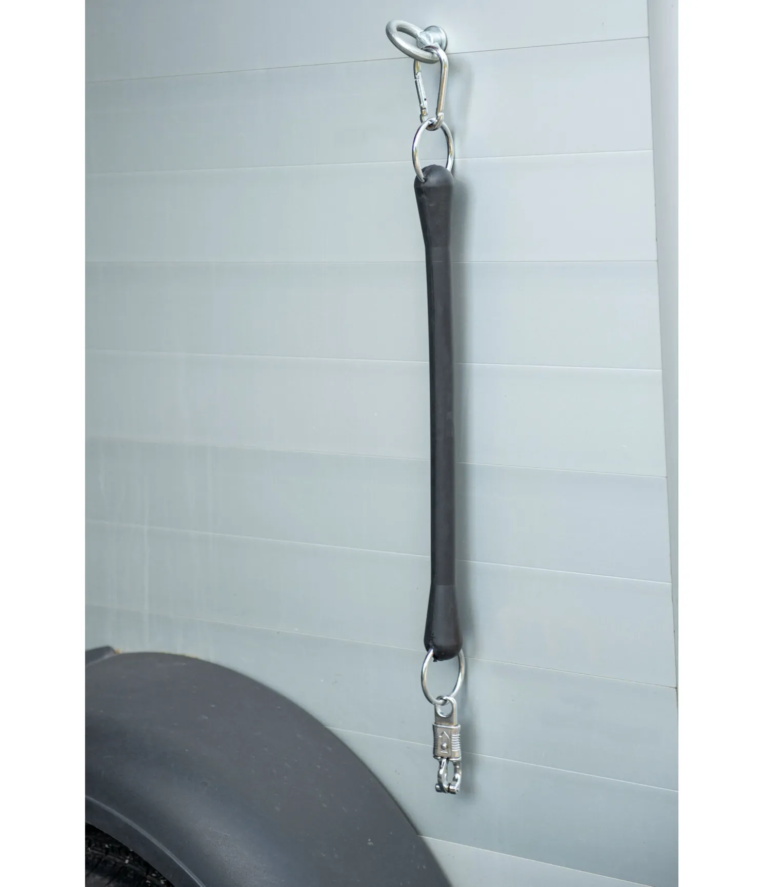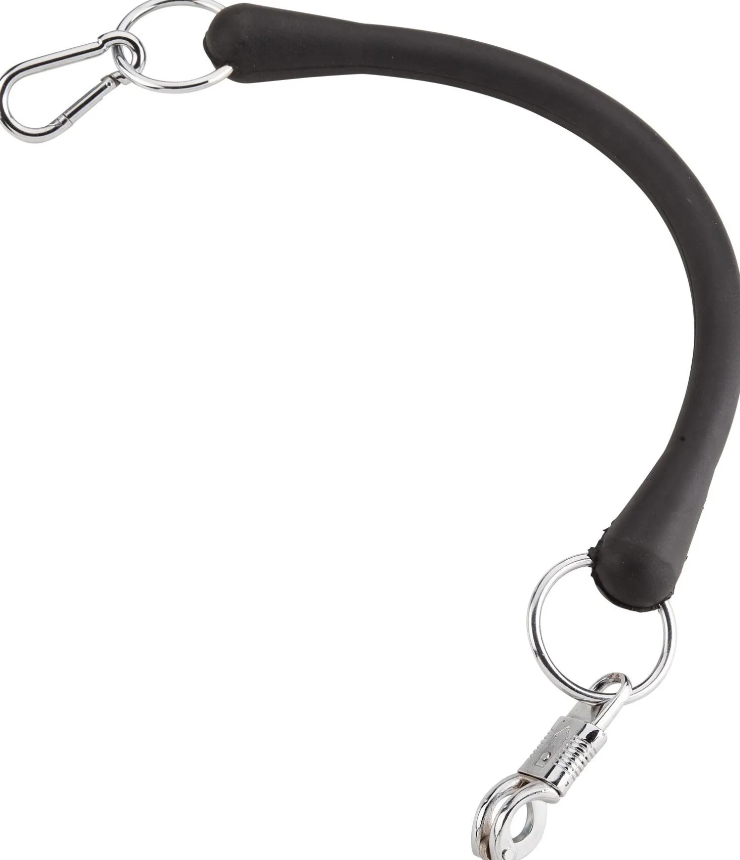 Attache en caoutchouc idéale pour le transport. Une extrémité avec mousqueton, l’autre avec mousqueton anti-panique. 50 cm.