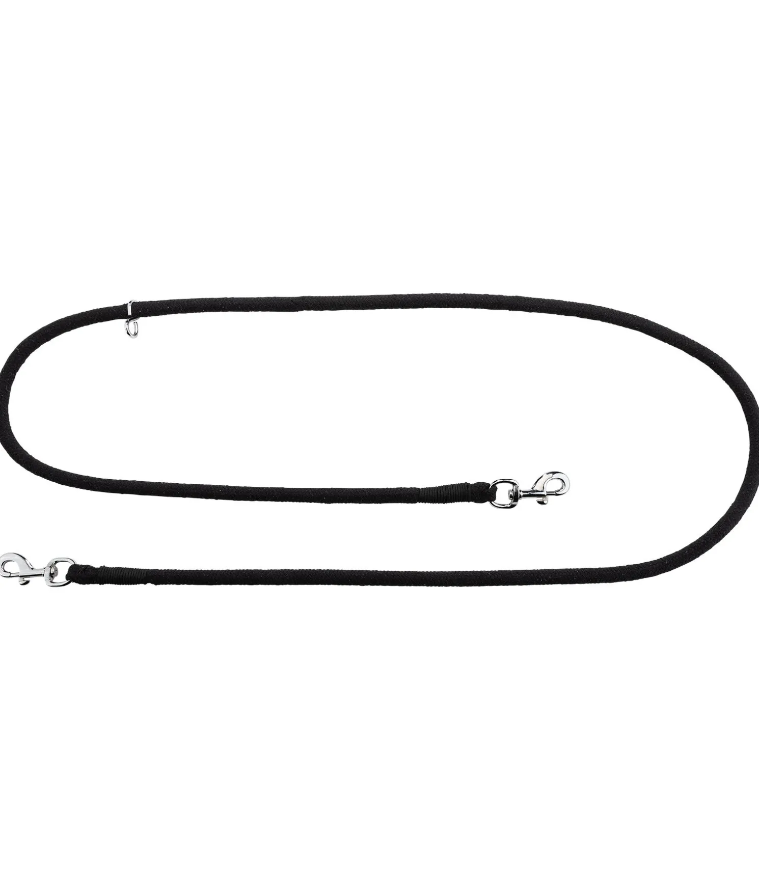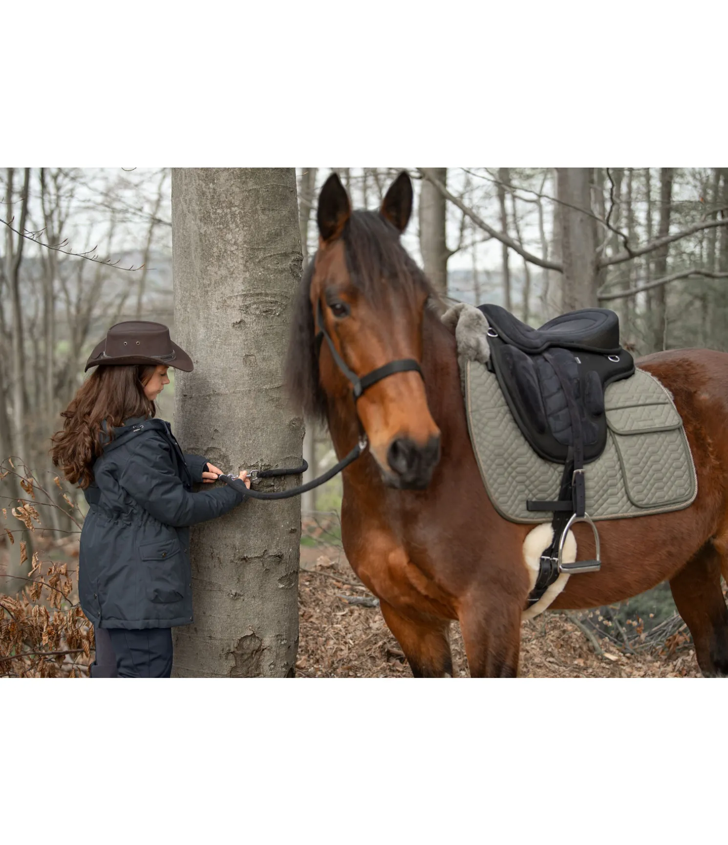 Longe de randonnée multifonctions, avec deux mousquetons à émerillon et un anneau coulissant. Permet d’attacher le cheval à un arbre ou à un piquet pendant la pause et peut également être utilisée comme longe. Il suffit de régler l’anneau coulissant en fonction de la circonférence du tronc et d’accrocher le mousqueton dans l’oeillet prévu à cet effet. Grâce aux deux mousquetons, la longe est facile à attacher à la selle pendant la randonnée. 100 % coton.