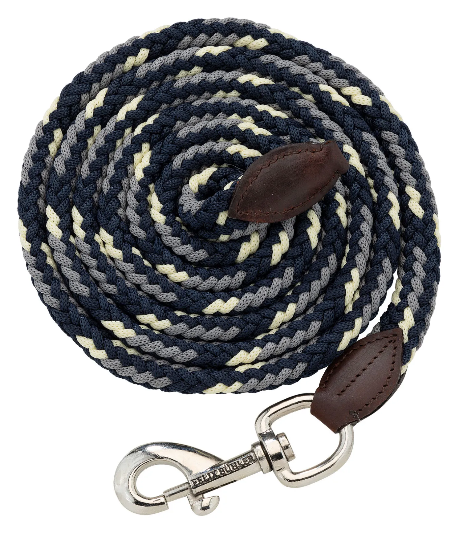 Longe tressée ronde très résistante avec élégants embouts en cuir et mousqueton. Assortie au licol 310040. Bouclerie argentée. 2 m. 100 % polypropylène.